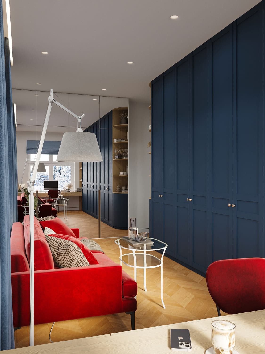 Кабинет в этом доме стал одновременно рабочей и уютной зоной для отдыха. Здесь выделяются глубокие синие шкафы, которые создают эффект строгости и собирают пространство воедино. Их строгая геометрия уравновешивается тёплыми деревянными вставками и открытыми полками, где можно разместить книги и детали декора.