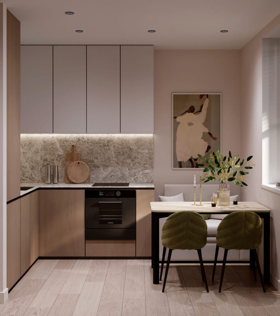 Фартук и столешница выполнены из материала с мягким мраморным рисунком, который оживляет пространство и добавляет фактуру. Подсветка под верхними шкафами делает рабочую зону визуально лёгкой и подчёркивает структуру камня.