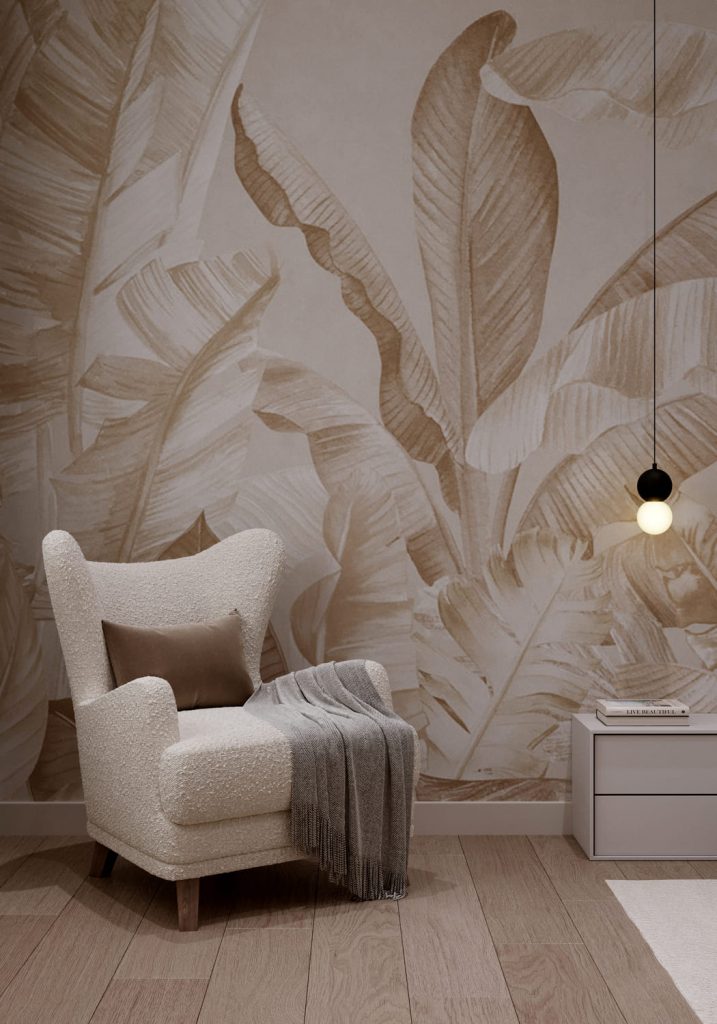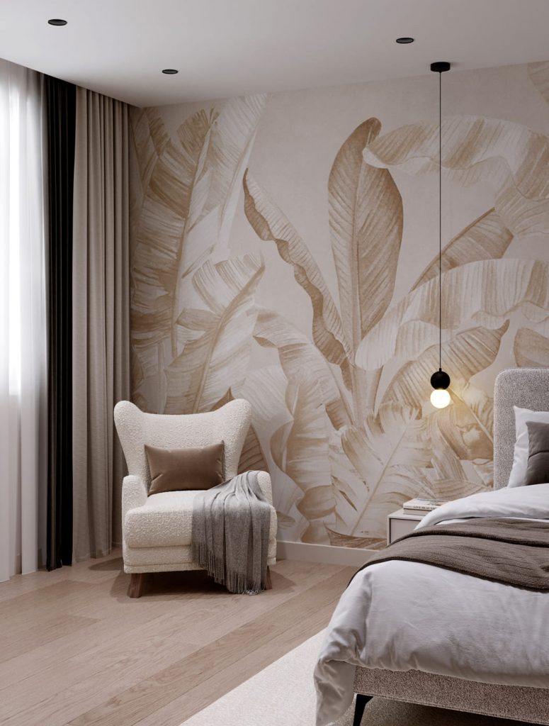 Светлые стены и текстуры создают ощущение лёгкости, а главный акцент — фреска с изображением листьев за изголовьем кровати. Она задаёт спокойное, почти природное настроение и делает комнату особенно уютной.