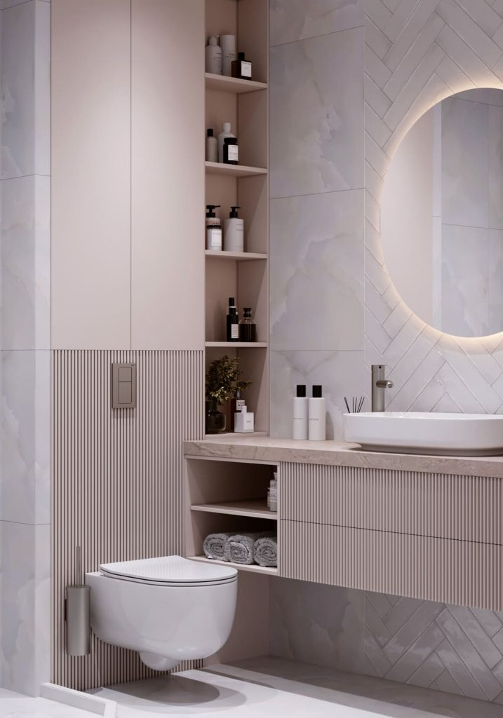 Мягкий беж и светлый мрамор создают ощущение чистоты и покоя. Пространство продумано до мелочей, чтобы даже небольшая площадь выглядела лёгкой и функциональной. Главный акцент — круглое зеркало с подсветкой. Оно мягко рассеивает свет, делая комнату уютной и визуально просторнее. Под раковиной — подвесная тумба с рифлёными фасадами и открытыми нишами для хранения. Душевая зона оформлена стеклянной перегородкой и сантехникой лаконичного дизайна.