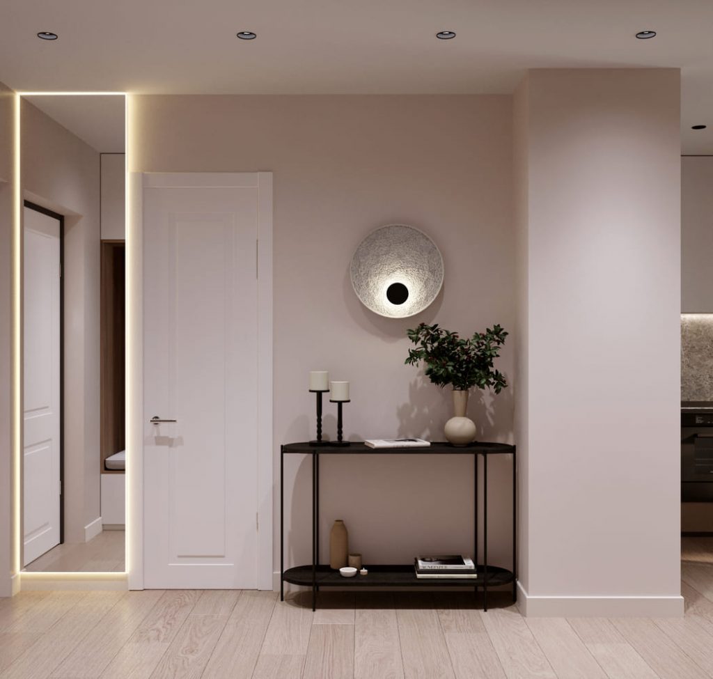 С другой стороны расположено консольное столик с лёгкой чёрной рамой. На нём — несколько деталей, задающих настроение: пара свечей, керамическая ваза с ветками и книга. Зеркало с подсветкой визуально добавляет глубины, а аккуратный светильник на стене завершает композицию.