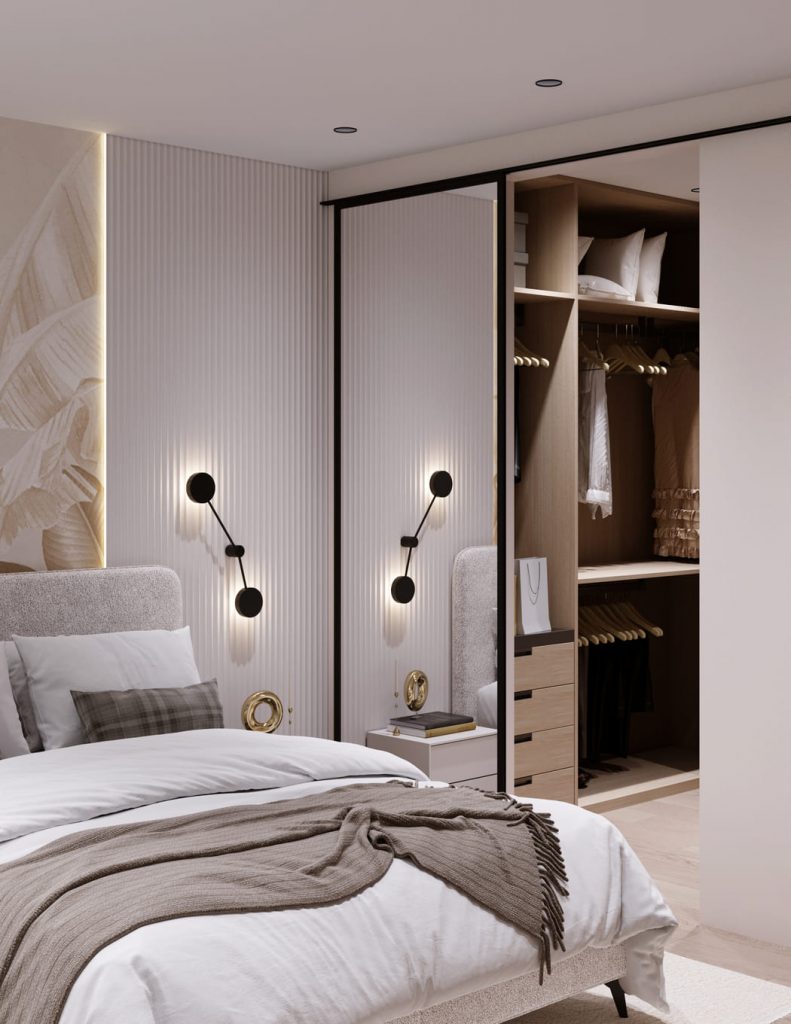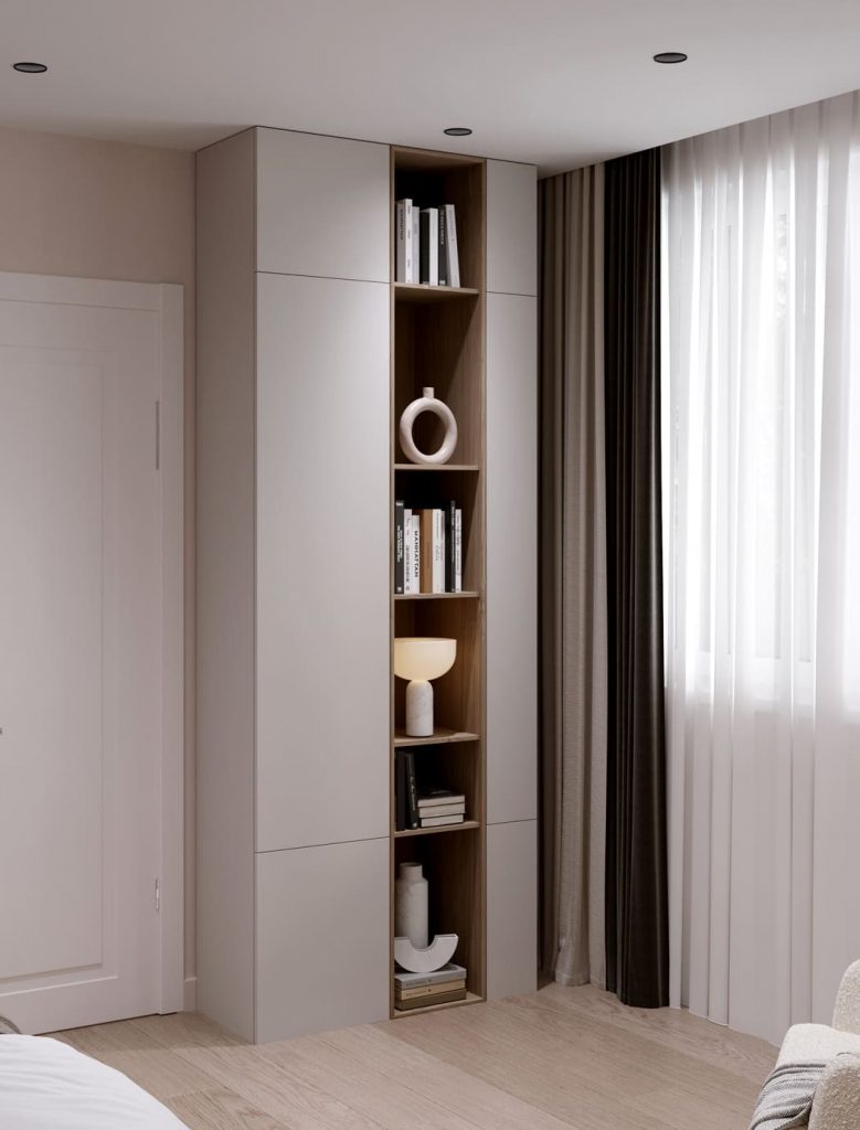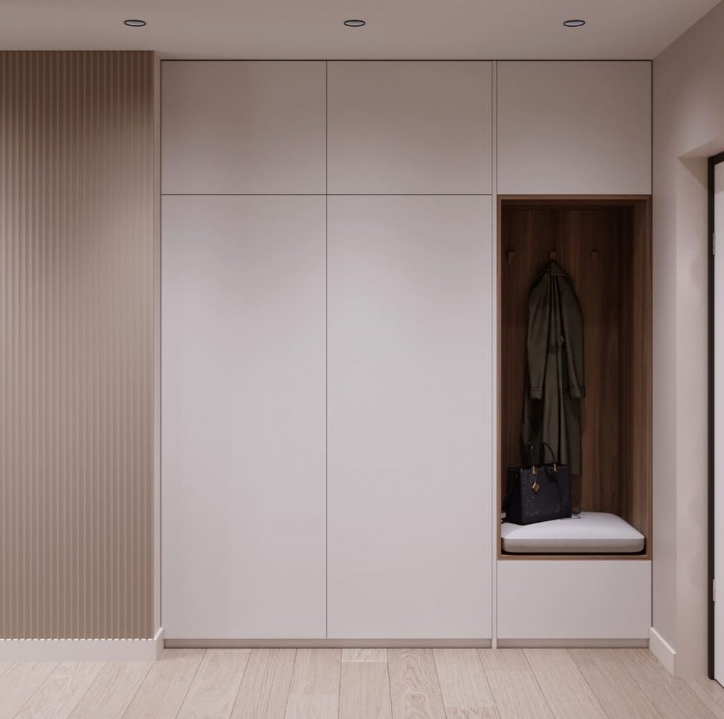 Главная роль отведена вместительному шкафу с лаконичными фасадами. Встроенная ниша с деревянной отделкой и мягким сиденьем делает зону хранения не только функциональной, но и уютной.