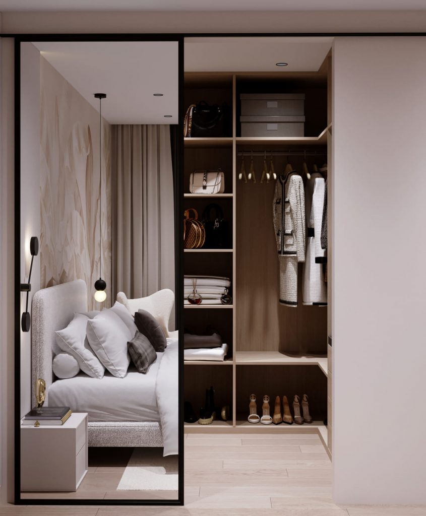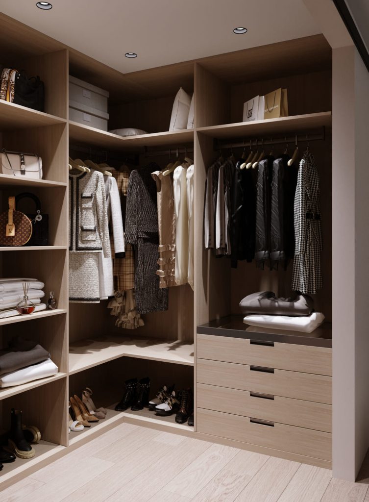 Гардеробная выполнена в тех же тёплых оттенках, что и спальня. Открытые полки и удобные штанги позволяют легко поддерживать порядок, а встроенная система хранения делает пространство максимально функциональным.