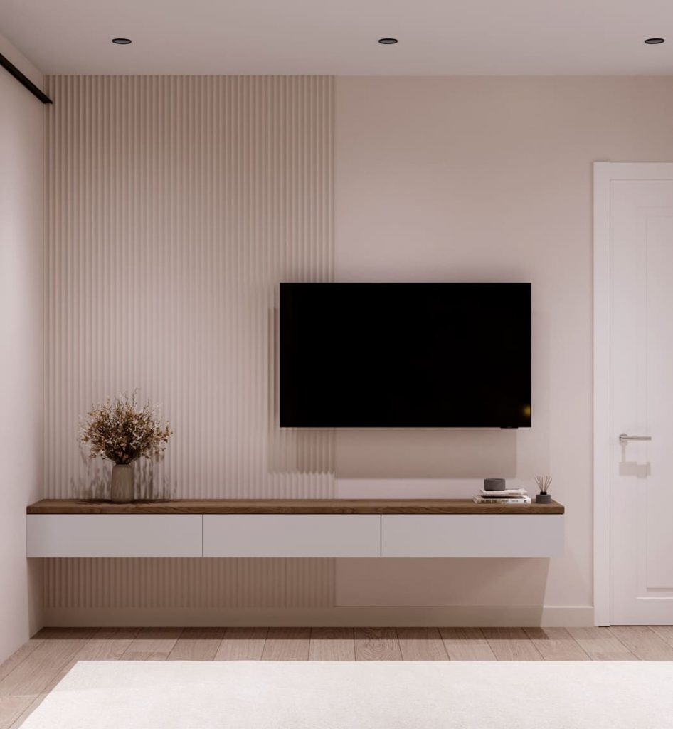 На противоположной стене расположена лаконичная ТВ-зона с подвесной тумбой и декором в нейтральных тонах. Всё продумано до мелочей, чтобы ничто не отвлекало от отдыха.