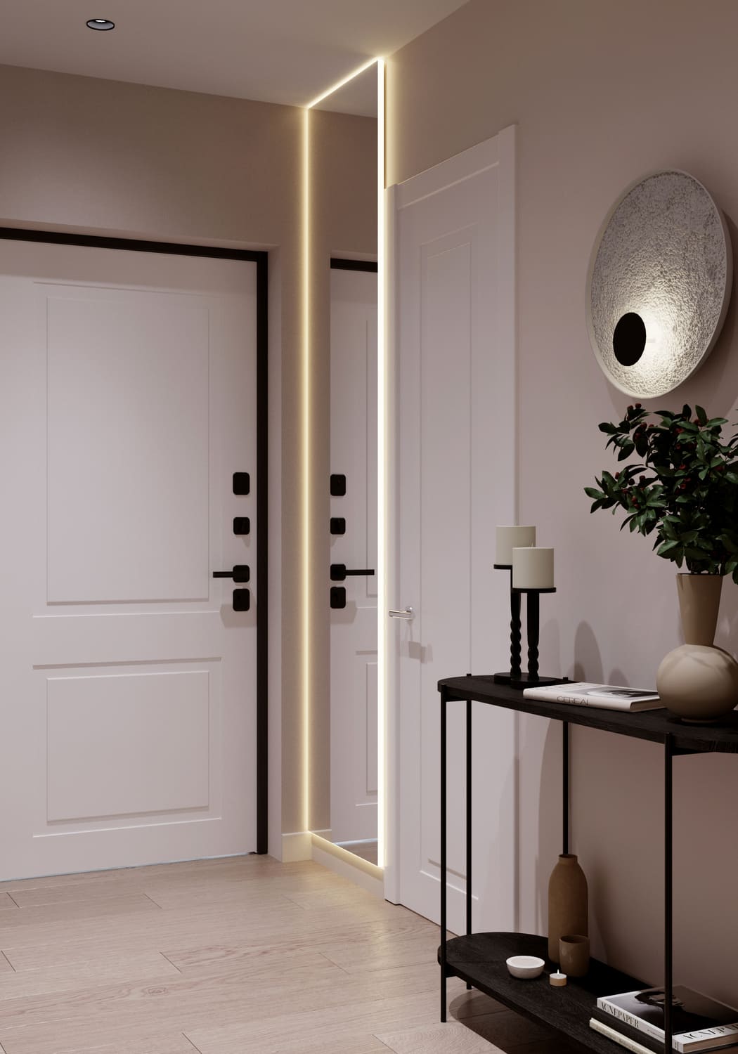 С другой стороны расположено консольное столик с лёгкой чёрной рамой. На нём — несколько деталей, задающих настроение: пара свечей, керамическая ваза с ветками и книга. Зеркало с подсветкой визуально добавляет глубины, а аккуратный светильник на стене завершает композицию.