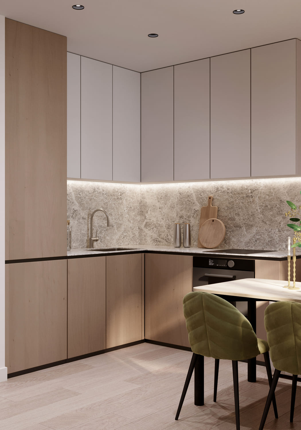 Фартук и столешница выполнены из материала с мягким мраморным рисунком, который оживляет пространство и добавляет фактуру. Подсветка под верхними шкафами делает рабочую зону визуально лёгкой и подчёркивает структуру камня.