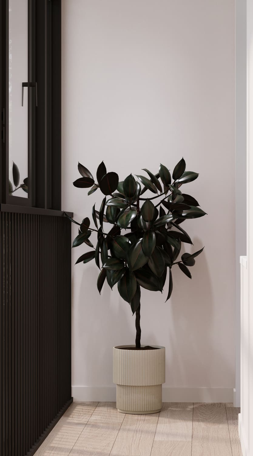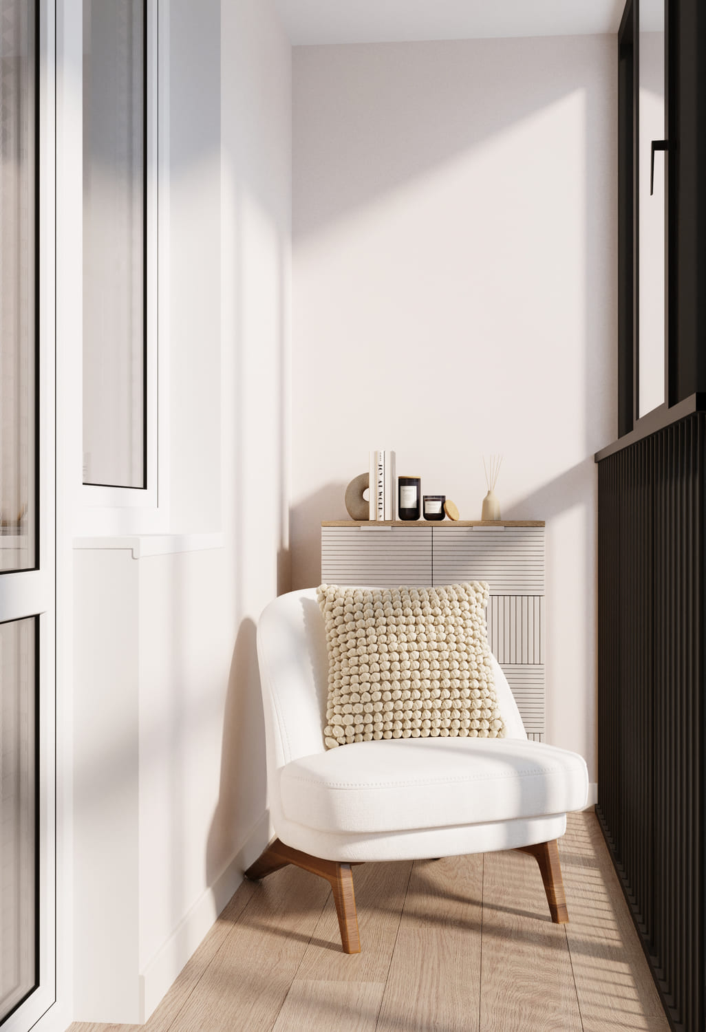 Небольшое кресло с мягкой подушкой приглашает устроиться поудобнее с чашкой кофе или книгой. Рядом — аккуратная тумба с декоративными деталями и ароматическими свечами, которые делают пространство по-настоящему домашним. Большие окна наполняют зону естественным светом, а сочетание белых и чёрных элементов создаёт лёгкий графичный акцент. Небольшое зелёное растение в ребристом горшке добавляет жизни и завершает композицию.