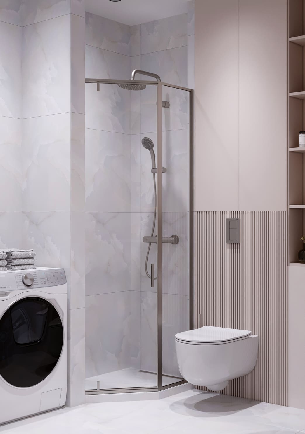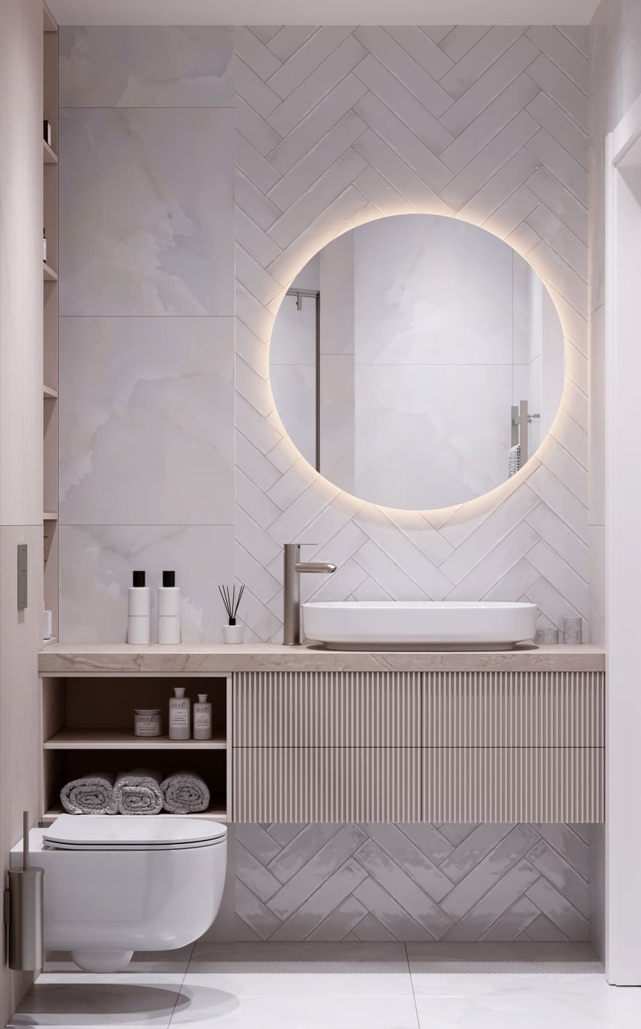 Мягкий беж и светлый мрамор создают ощущение чистоты и покоя. Пространство продумано до мелочей, чтобы даже небольшая площадь выглядела лёгкой и функциональной. Главный акцент — круглое зеркало с подсветкой. Оно мягко рассеивает свет, делая комнату уютной и визуально просторнее. Под раковиной — подвесная тумба с рифлёными фасадами и открытыми нишами для хранения. Душевая зона оформлена стеклянной перегородкой и сантехникой лаконичного дизайна.