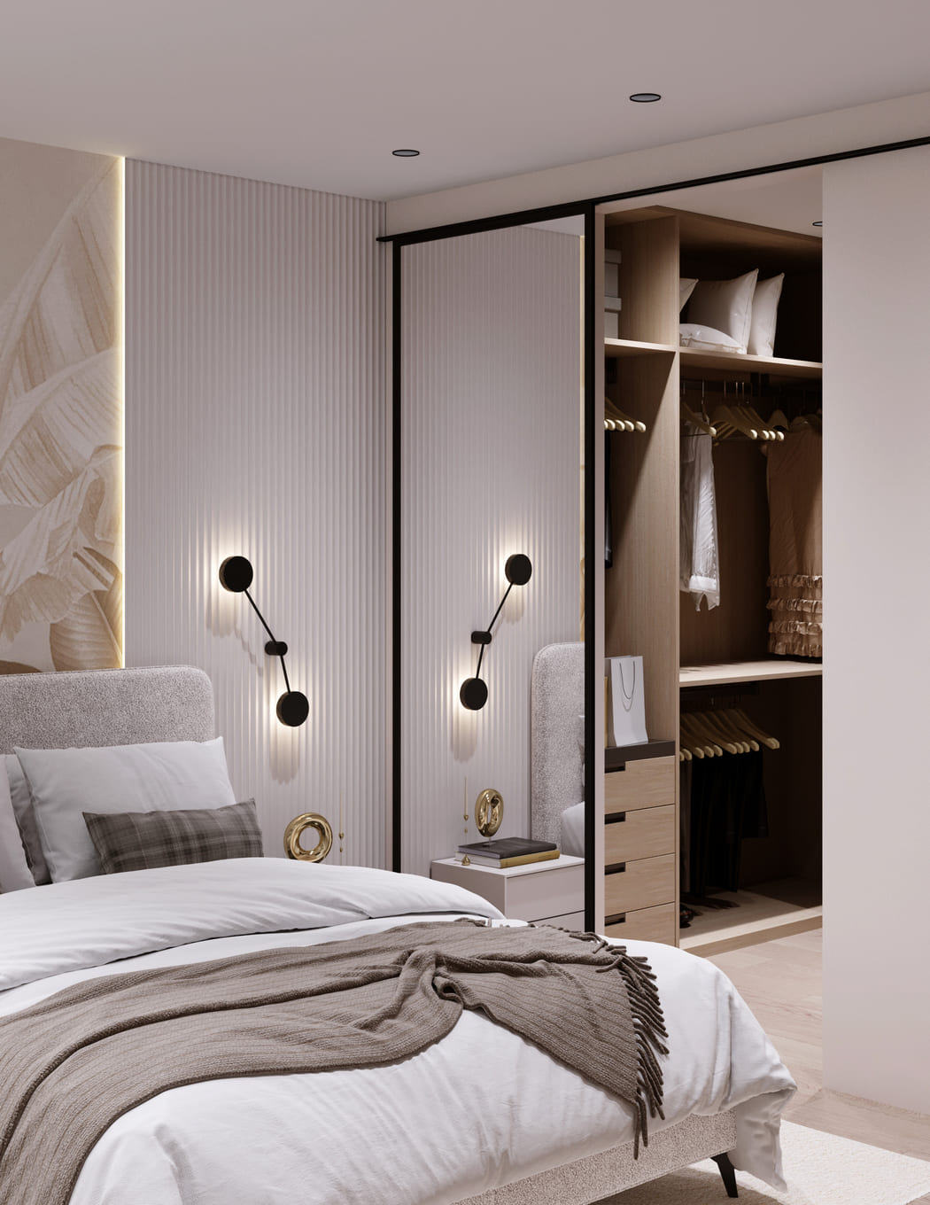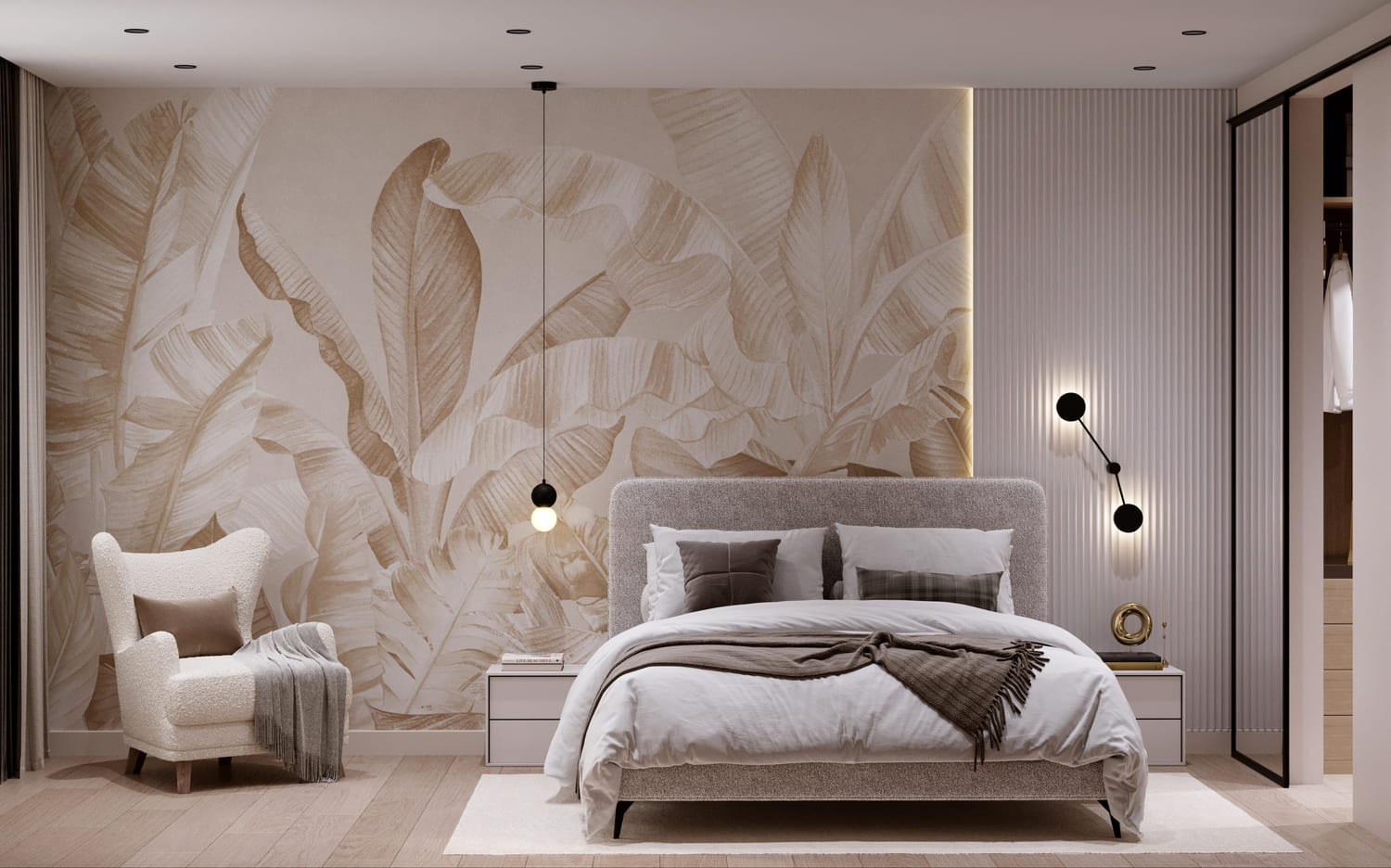 Светлые стены и текстуры создают ощущение лёгкости, а главный акцент — фреска с изображением листьев за изголовьем кровати. Она задаёт спокойное, почти природное настроение и делает комнату особенно уютной.