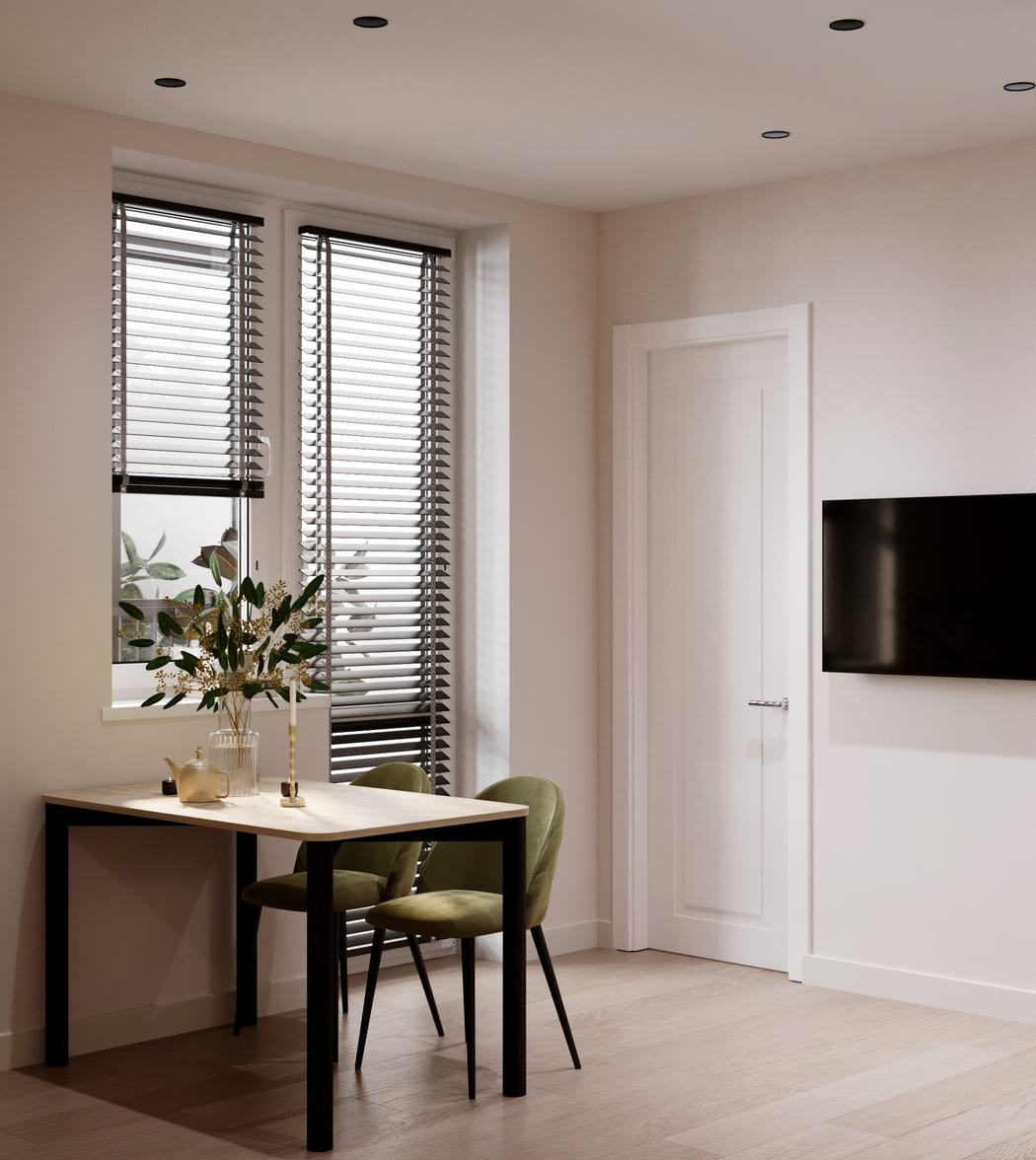 В основе — мягкий бежевый оттенок, создающий ощущение тепла и уюта. Он объединяет все зоны квартиры и делает пространство цельным. Контраст добавляют чёрные элементы мебели и светильников. А зелёные стулья и постер с листьями придают интерьеру живость и природную свежесть.