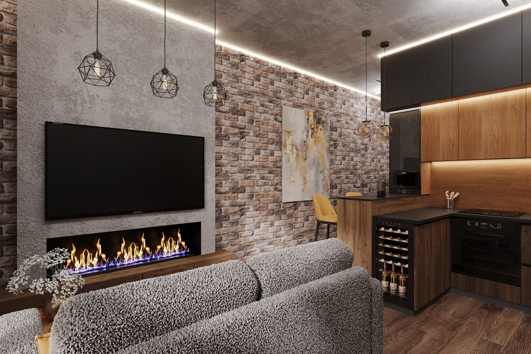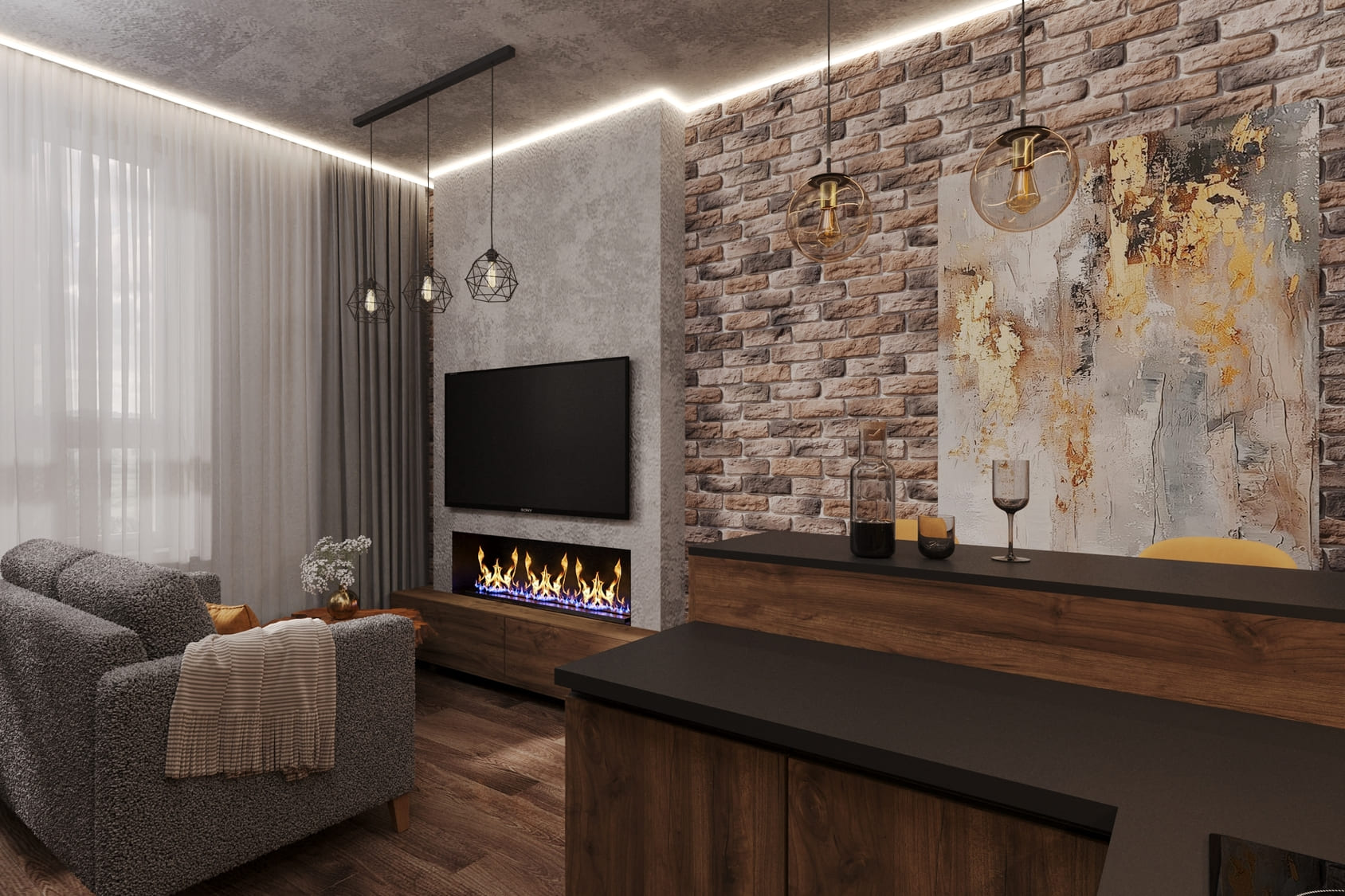 В зоне гостиной — уютный текстурный диван в серых тонах и акцентные горчичные подушки, которые поддерживают цвет стульев у стойки. Центром композиции стала стена с декоративным кирпичом и встроенным биокамином — он создаёт ощущение тепла и делает интерьер более эмоциональным.