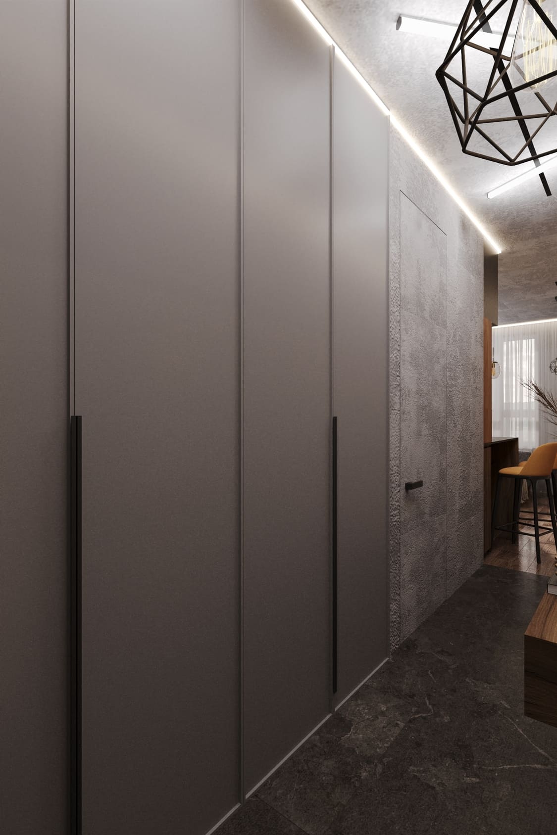 Встроенные шкафы выполнены в спокойном сером тоне и полностью растворяются в стене — за счёт скрытых фасадов коридор остаётся аккуратным и не перегруженным. Узкая деревянная консоль поддерживает тему натуральных материалов и служит удобным местом для мелочей.