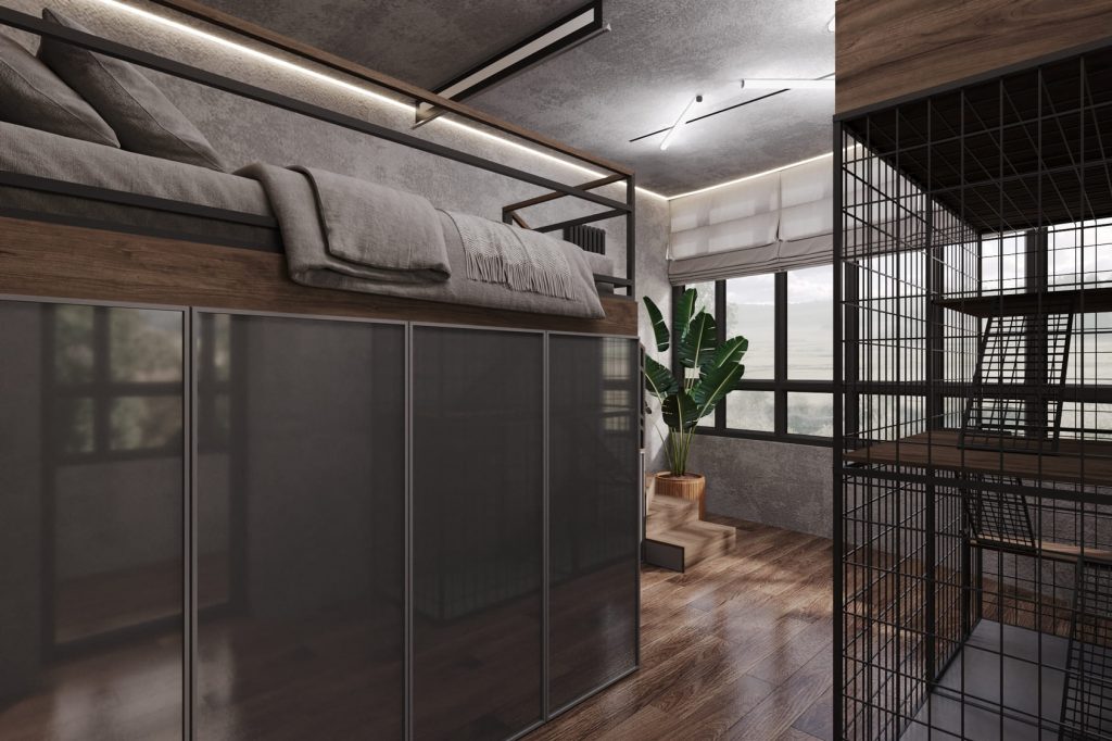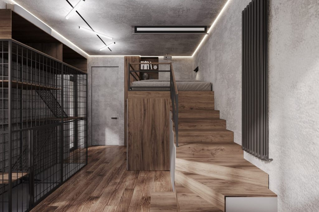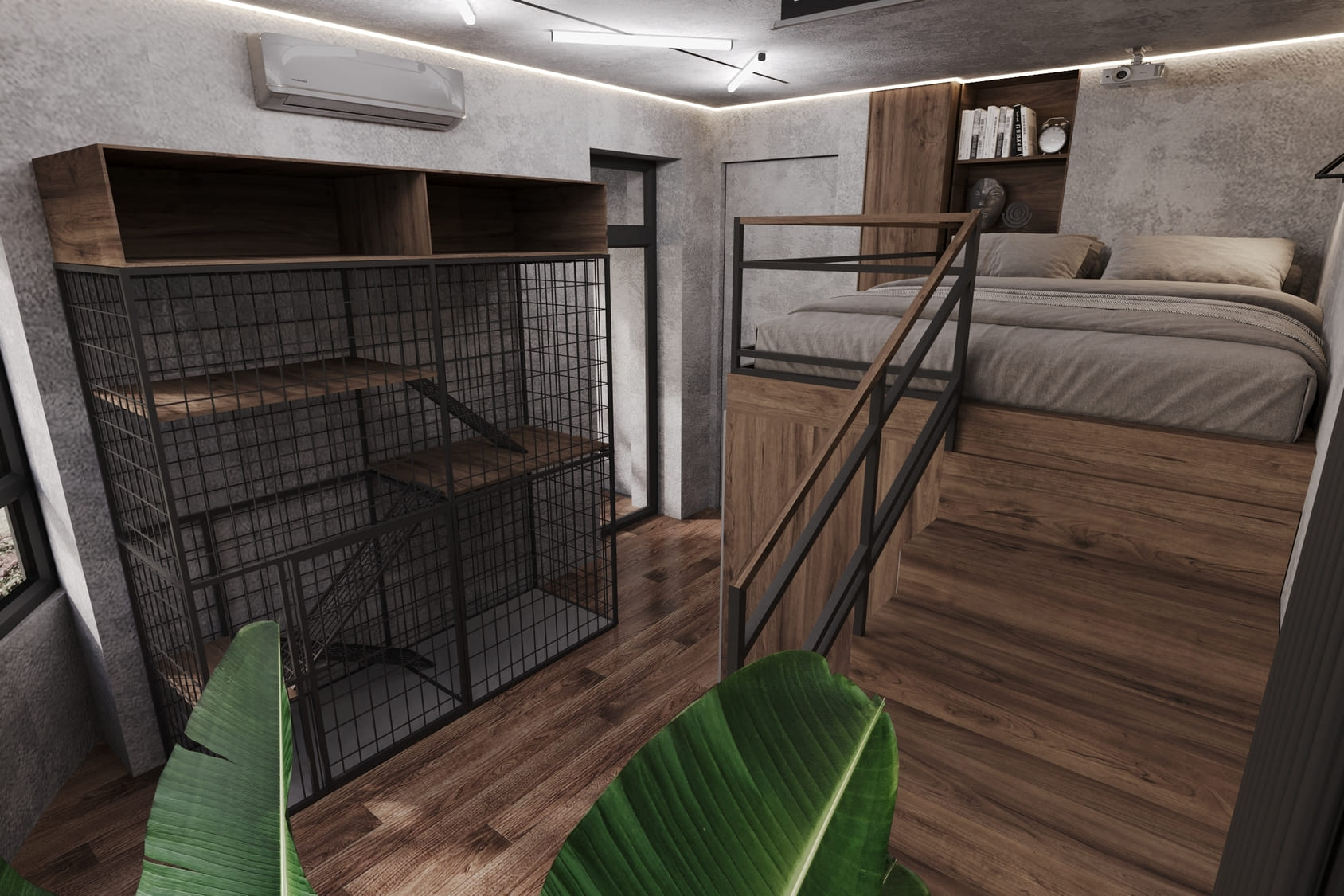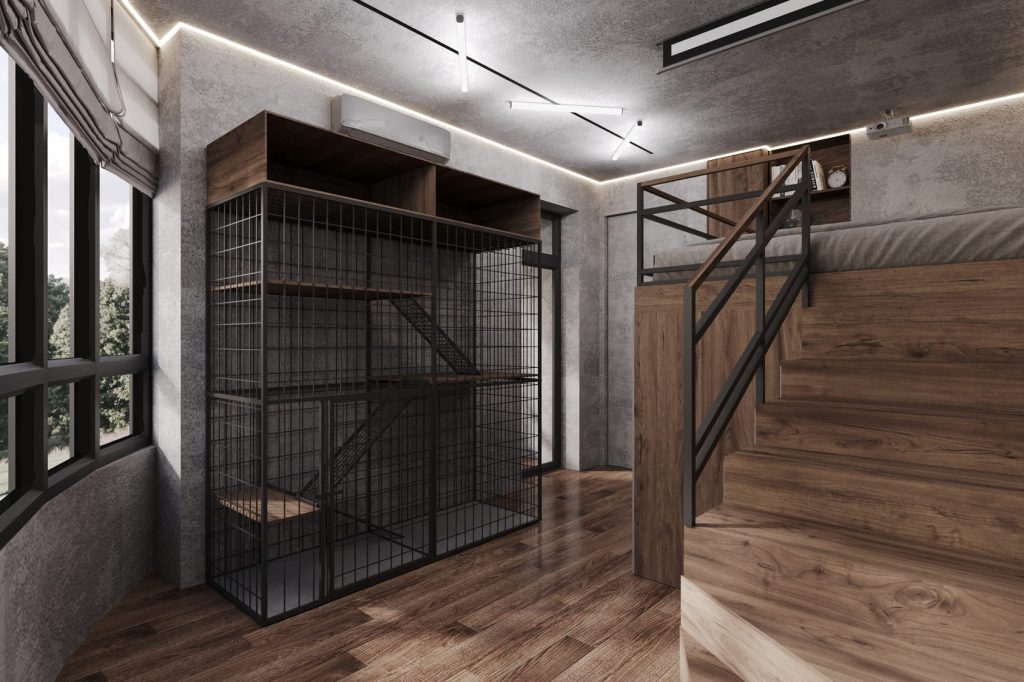 Отдельный функциональный элемент — просторная клетка для енота, разработанная специально под запрос хозяев. Она занимает место у окна и выполнена как полноценная многоярусная зона с лестницами, полками и укрытиями. Конструкция вписана в интерьер за счёт сочетания дерева и чёрного металла, полностью поддерживая общую лофт-стилистику.