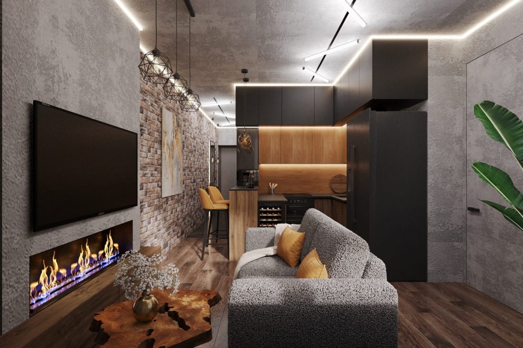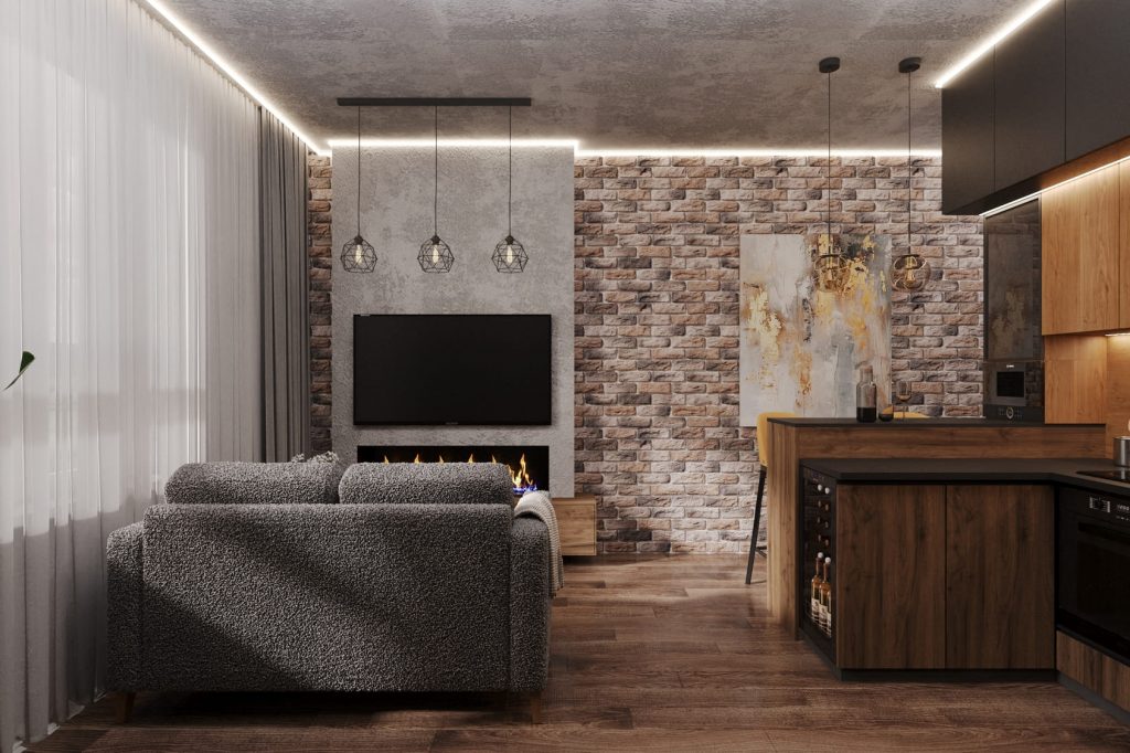 Дизайн-проект квартиры евродвушки с сохранением планировки от застройщика в сочетании натурального дерева, фактурного камня и декоративной кирпичной кладки с прихожей и коридором, кухней-гостиной, спальней и санузлом