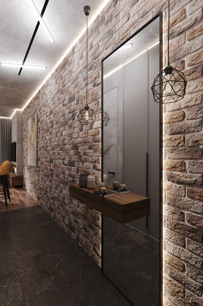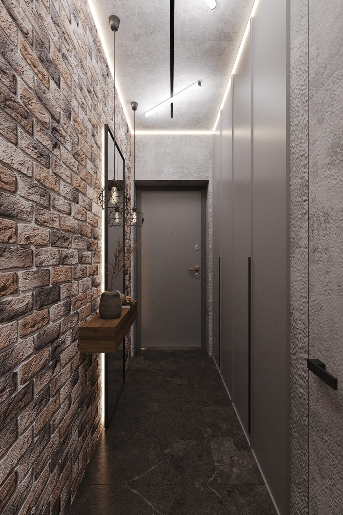 Прихожая получилась узкой, но очень выразительной — она сразу задаёт настроение всей квартиры. Основным акцентом стала стена с кирпичной кладкой: тёплая, фактурная, она добавляет глубины и подчёркивает лофтовый характер интерьера. Напротив размещён высокий зеркальный модуль с подсветкой, который визуально расширяет пространство и делает коридор светлее.