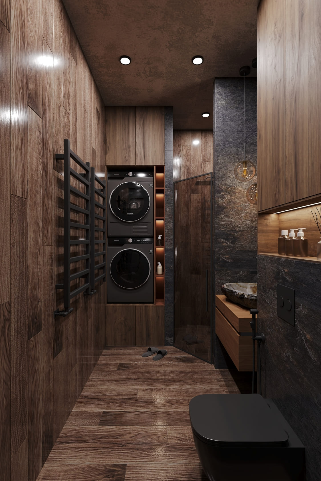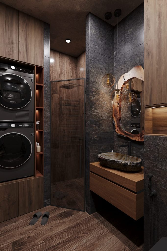 Стены отделаны фактурной тёмной плиткой под камень, а часть поверхностей выполнена в древесных оттенках, что создаёт баланс между брутальностью и теплотой. Встраиваемые шкафы и открытые ниши обеспечивают удобное хранение, не нарушая цельности интерьера.