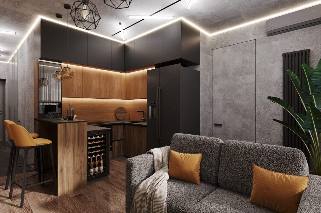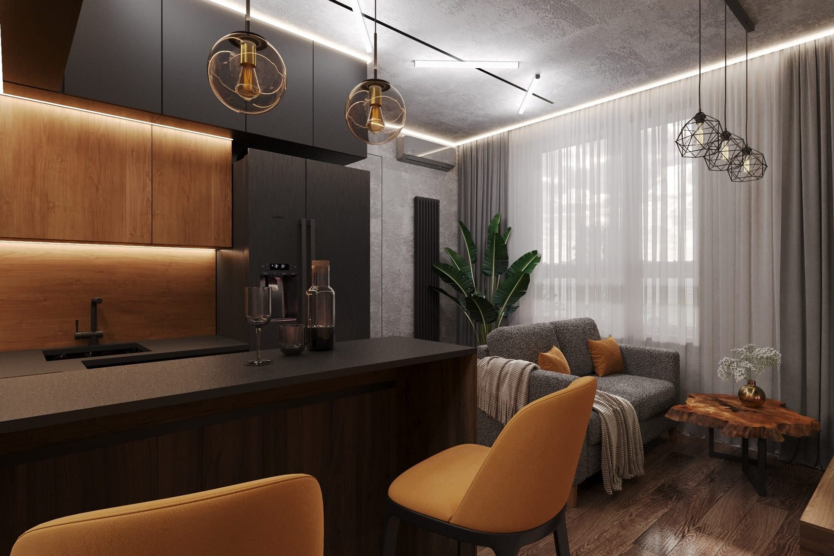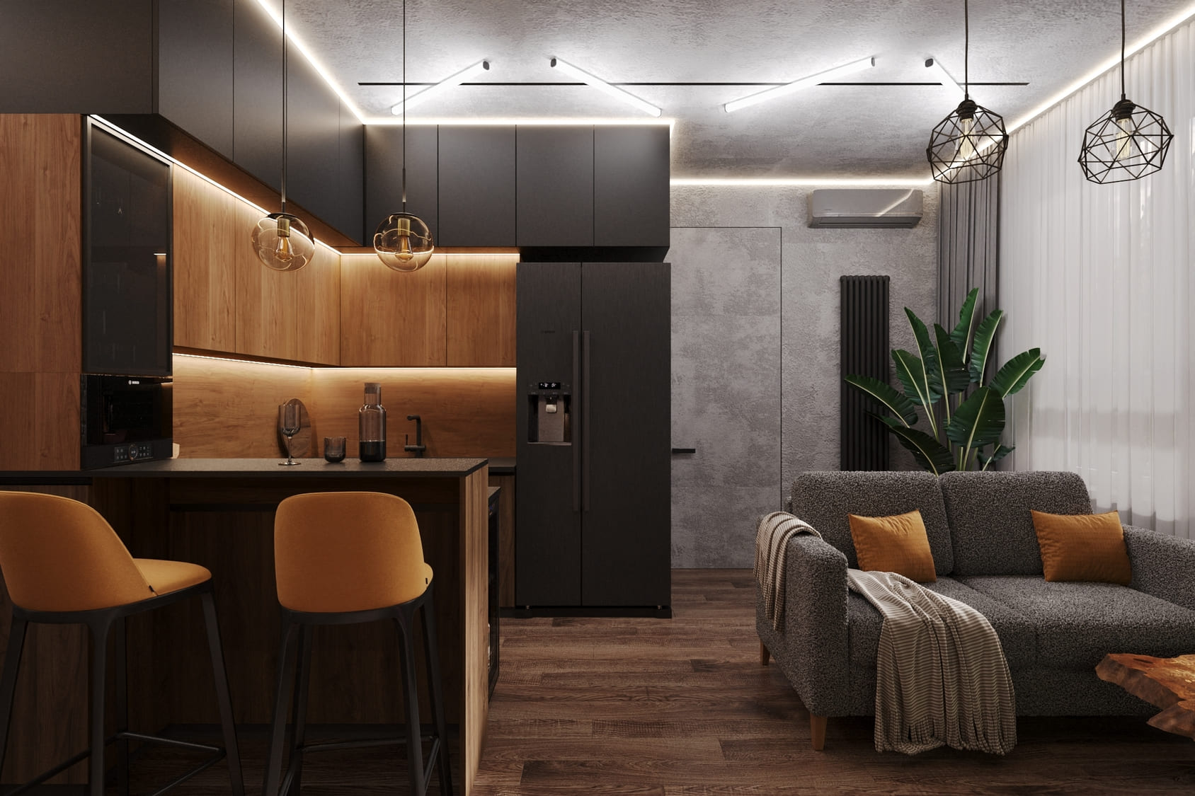 Освещение продумано по нескольким сценариям: линейная подсветка по периметру, современная графичная система на потолке и акцентные подвесы над стойкой и диваном. Это позволяет легко менять настроение пространства — от яркого рабочего света до мягкой вечерней атмосферы.