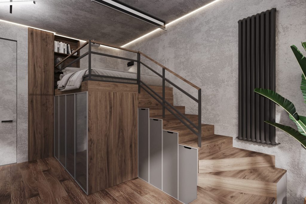 Подиумная лестница не только ведёт на спальное место, но и служит системой хранения: в каждую ступень интегрированы выдвижные ящики.