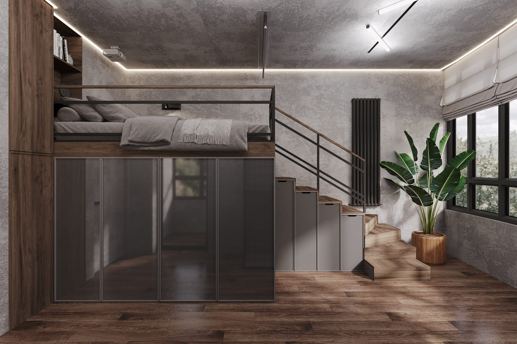 Главная особенность — антресоль-кровать, расположенная на подиуме со встроенными ступенями. Такое решение помогает использовать вертикальный объём комнаты и освобождает место внизу для большого гардеробного блока. Фасады выполнены в спокойных приглушённых тонах, а дерево добавляет тепла и делает конструкцию визуально лёгкой.