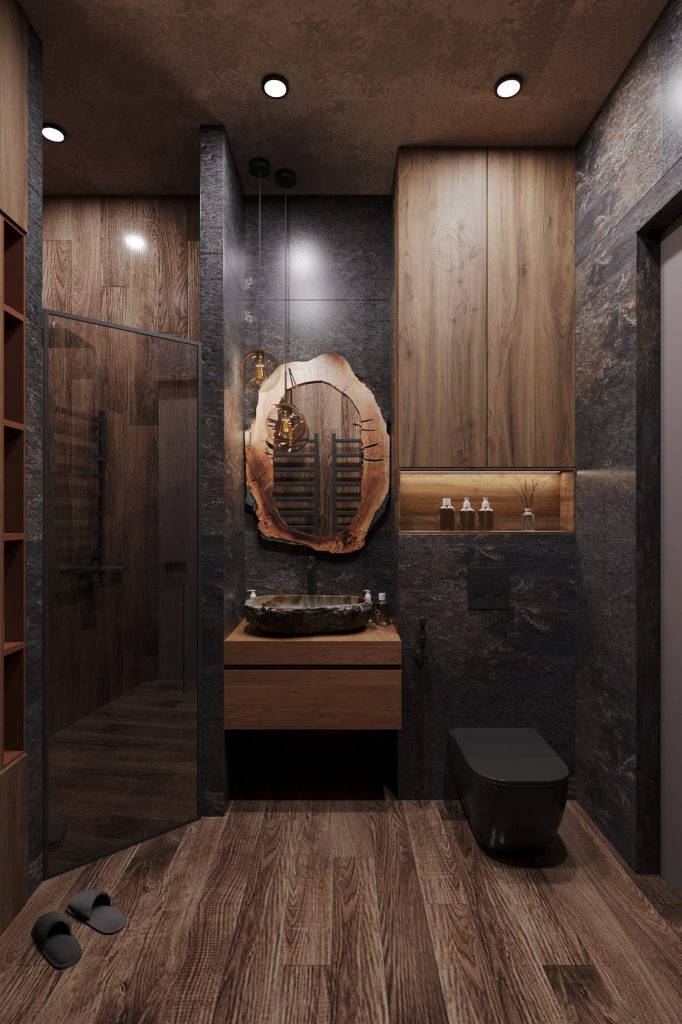 Санузел оформлен в глубоких, насыщенных тонах и стал одной из самых атмосферных зон в квартире. Здесь сочетаются тёмный камень, тёплое дерево и акцентные элементы, которые подчёркивают индивидуальность интерьера.
