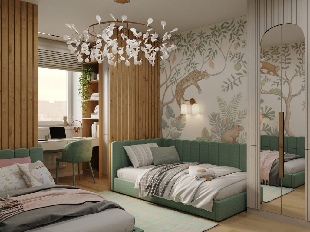 Главный декоративный акцент комнаты — большая фреска с животными и ветвями деревьев. Она создаёт атмосферу маленького волшебного мира, в котором живут леопард, капибара, птицы и забавные зверята на ветках.