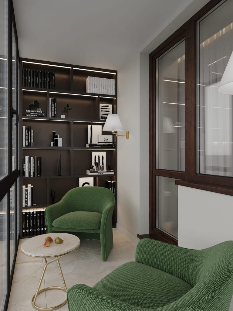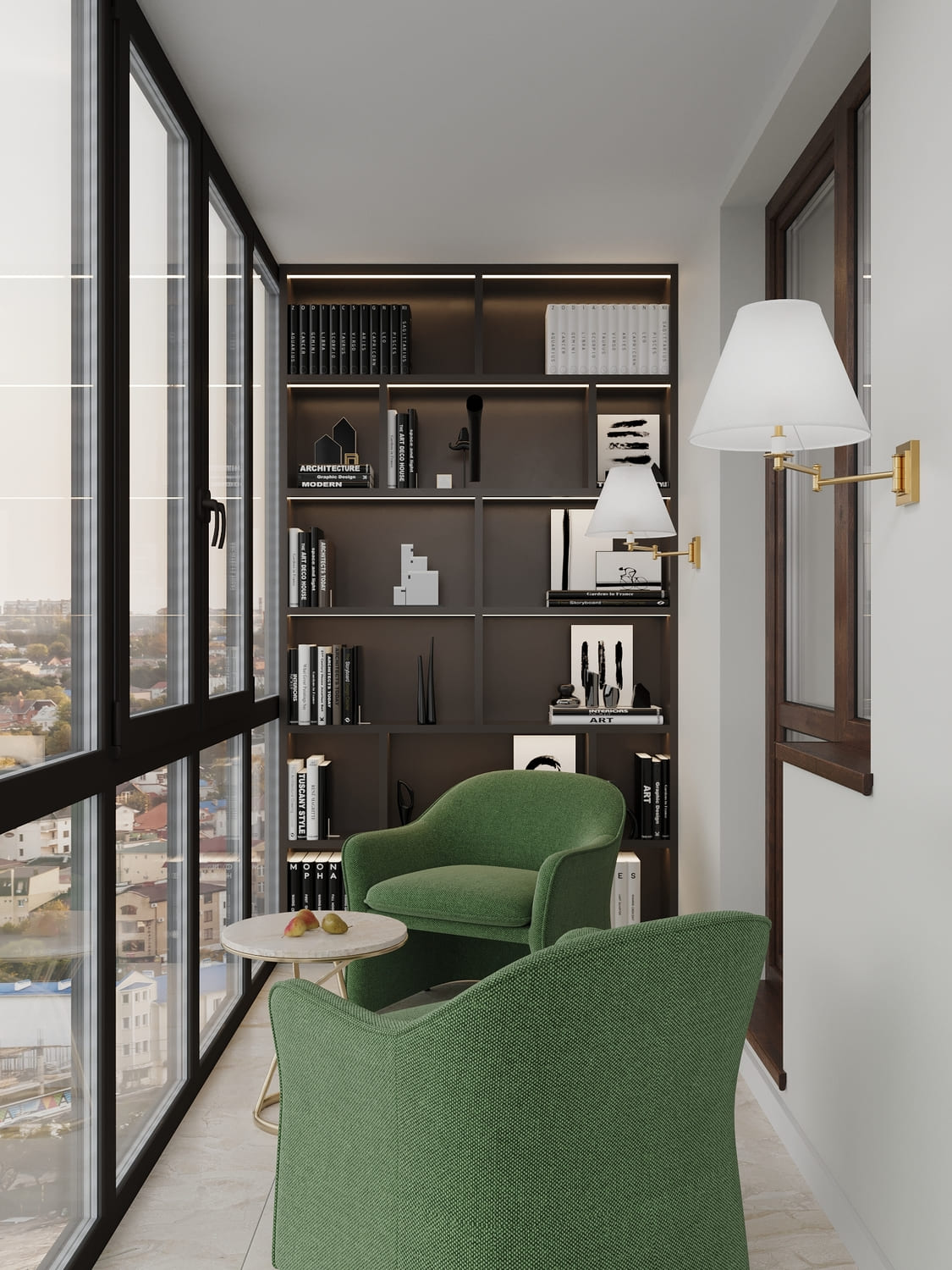 Главным элементом зоны стали два мягких кресла глубокого зелёного оттенка — ещё один “тон” зелёной гаммы, выбранной для проекта. Они комфортные, обволакивающие и задают атмосферу расслабления. Между ними — лёгкий журнальный столик с круглой каменной столешницей и золотым основанием: изящная деталь, которая объединяет композицию.