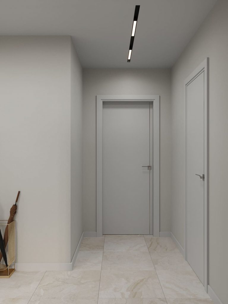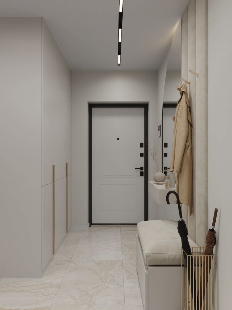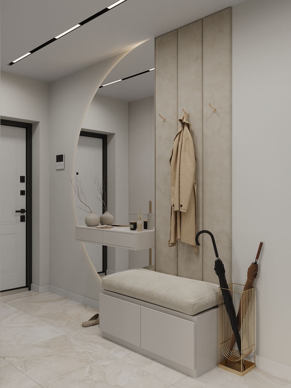 Прихожая оформлена в тёплых светлых оттенках, которые визуально расширяют пространство и подчёркивают уют. Вертикальные мягкие панели за зоной хранения создают акцентную композицию и добавляют интерьеру утончённости, а встроенная подсветка мягко “подчеркивает” изгиб декоративной панели.