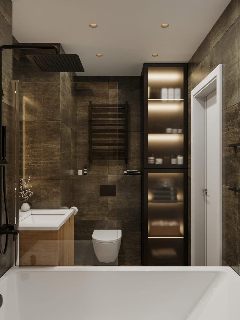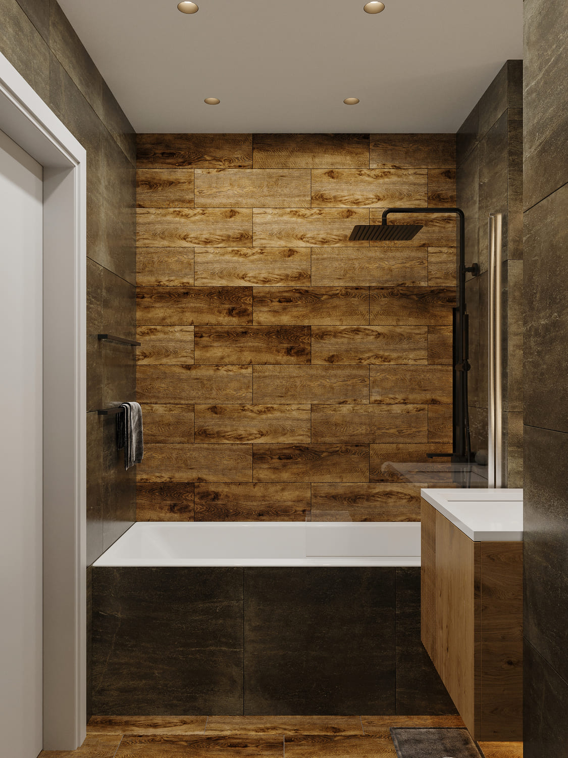 Стены облицованы крупноформатной плиткой под тёмный камень с красивой матовой фактурой. Она добавляет глубины и благородства, делает небольшой санузел визуально «дороже». В качестве противопоставления — акцентная стенка в зоне ванны, оформленная под дерево с живыми, тёплыми оттенками. За счёт такой комбинации интерьер смотрится объёмным и многослойным.