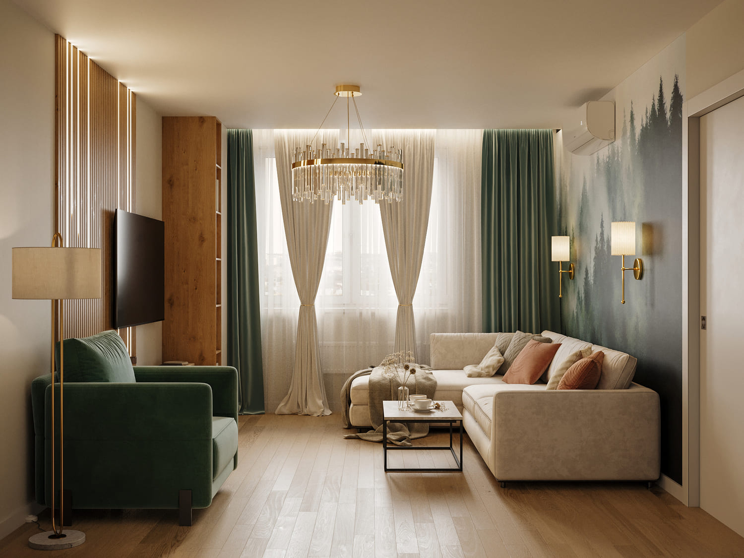 Дизайн-проект двухкомнатной квартиры для семьи с двумя детьми в светлой тёплой палитре в нежных бежевых оттенках с декоративными панелями и изящными фресками с главным акцентом интерьера в виде зеленого цвета с прихожей и коридором, кухней, гостиной, детской, санузлом и балконом