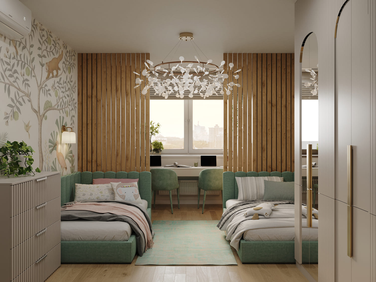 Два низких кроватных основания в мягкой зелёной обивке — не только уютные, но и безопасные. Цвет кроватей — один из “семейных” зелёных оттенков, использованных по всему проекту, и здесь он самый мягкий, пастельный. Текстиль подобран в спокойных тонах: серый, розовый, бирюзовый — они создают ощущение лёгкости и гармонии.