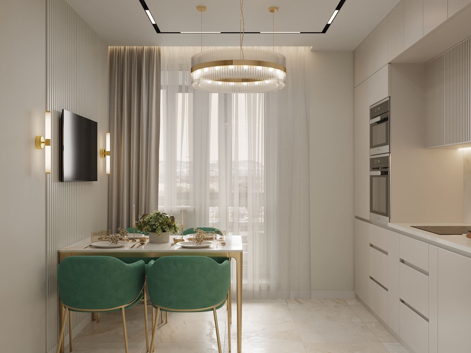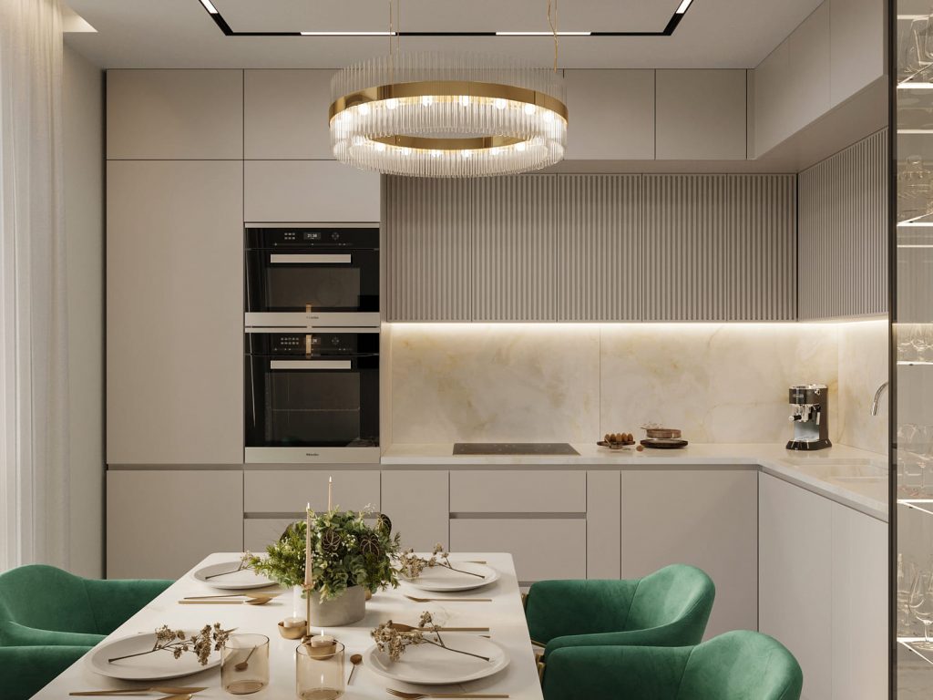 В центре композиции — изящная обеденная зона. Стулья глубокого изумрудного оттенка и стол со стройными золотистыми ножками создают ощущение лёгкости и праздничности даже в обычный будний день. Большая люстра с хрустальными элементами становится главным декоративным акцентом и наполняет кухню мягкими, переливчатыми бликами.