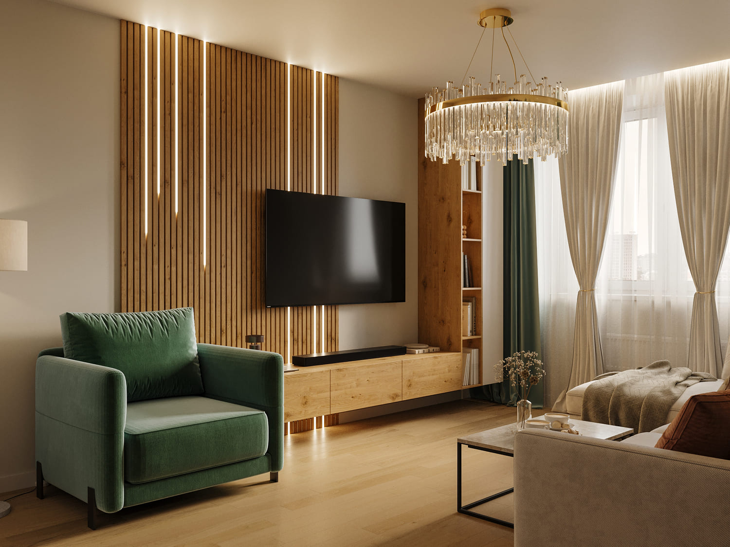 Противоположная стена оформлена тёплыми деревянными рейками с встроенной подсветкой. Они создают динамичный ритм, красиво подсвечивают зону ТВ и добавляют интерьеру глубины. Небольшая консоль под телевизором поддерживает древесную тему и даёт дополнительное хранение без визуального шума.