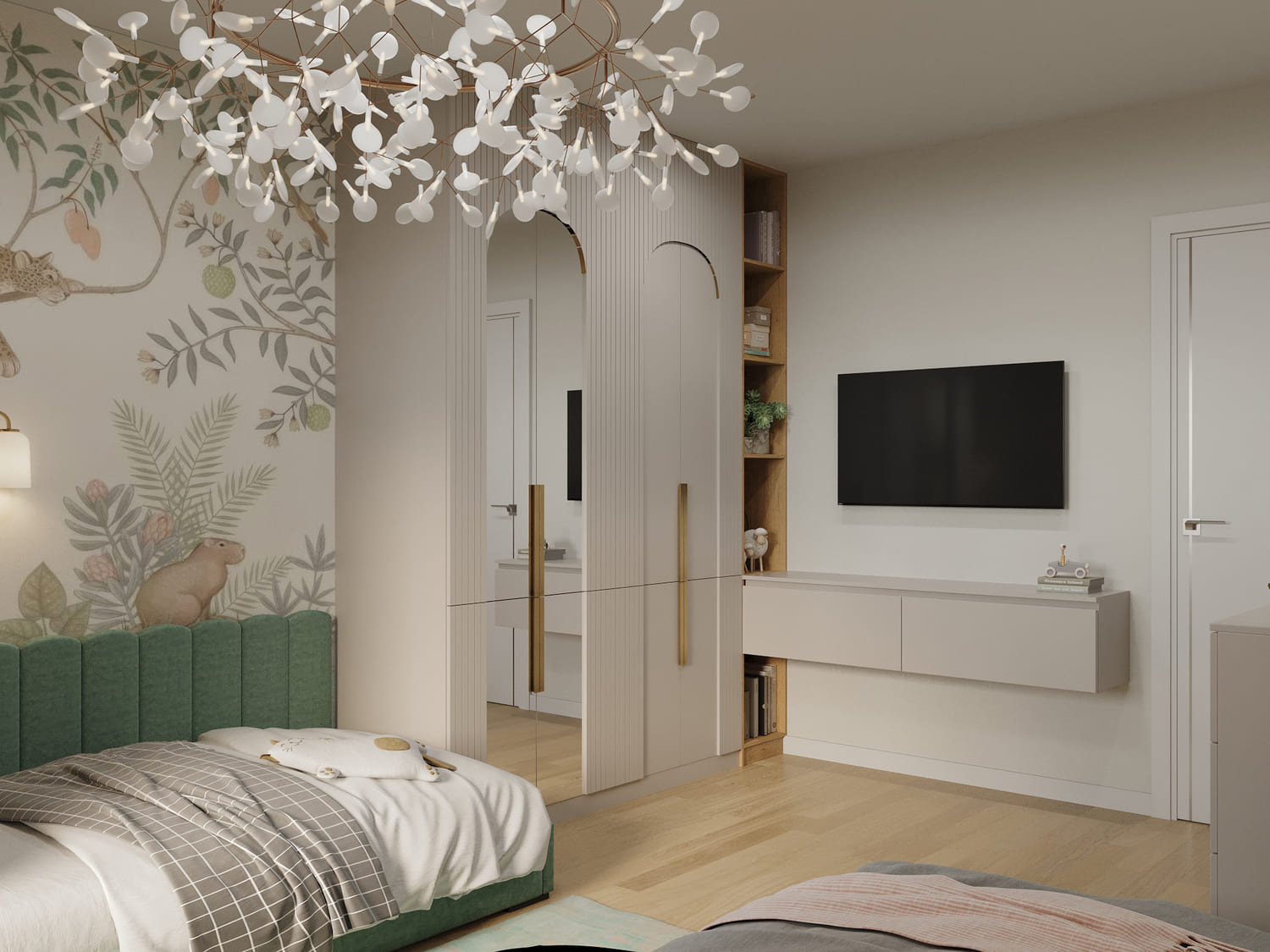 Этот проект — уютная двухкомнатная квартира для семьи с двумя детьми, где каждая деталь работает на ощущение тепла, света и спокойствия. Базой стало современное оформление, дополненное мягкими классическими акцентами: вертикальные панели, изысканная фреска, продуманные симметрии и тёплая природная палитра.