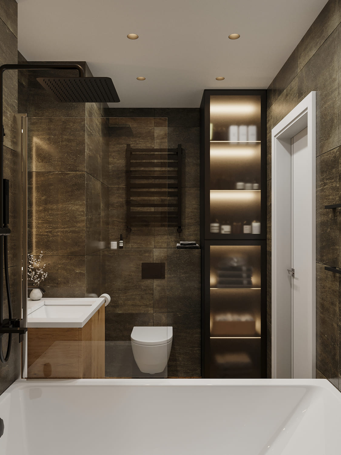 Ванна дополнена стеклянной перегородкой, которая удерживает брызги, но при этом сохраняет лёгкость и не дробит пространство. Чёрная матовая сантехника подчёркивает современный характер помещения: верхний тропический душ, смесители и лейка создают цельный графичный акцент.