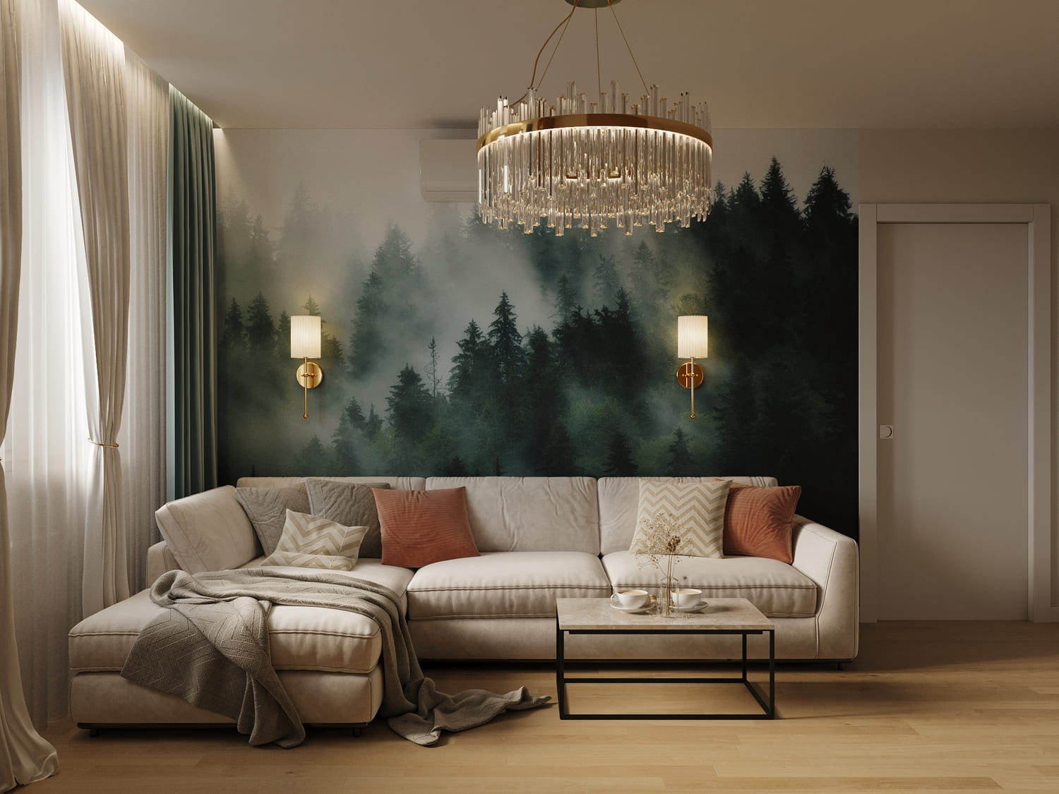 Главным визуальным акцентом пространства стала фреска с атмосферным лесным пейзажем: глубокие зелёные тона, лёгкая дымка и эффект глубины создают спокойное настроение и поддерживают идею единого зелёного акцента в интерьере.