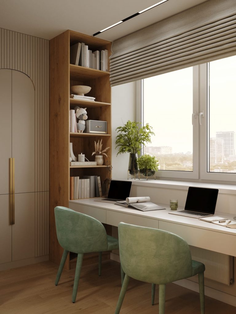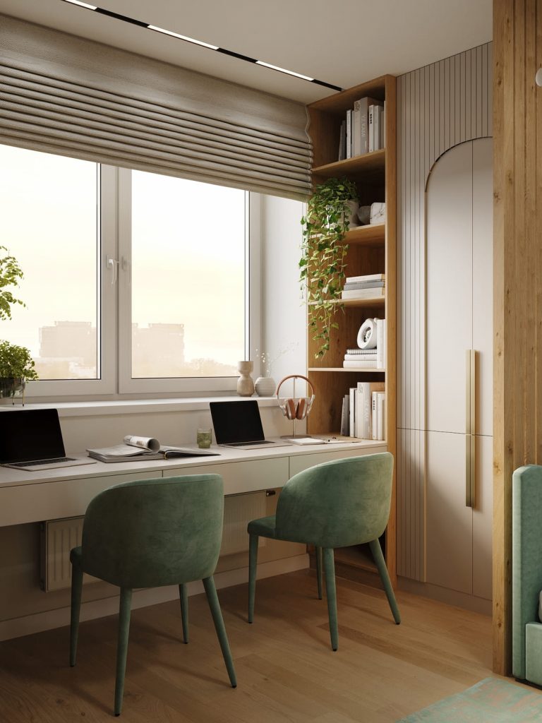 Деревянные рейки выполняют роль визуального зонирования, сохраняя при этом ощущение цельности комнаты. За ними организована рабочая зона — два полноценных места для занятий, творчества и учёбы. Большая столешница под окном освещена естественным светом, а открытые полки позволяют держать книги и любимые вещи под рукой.