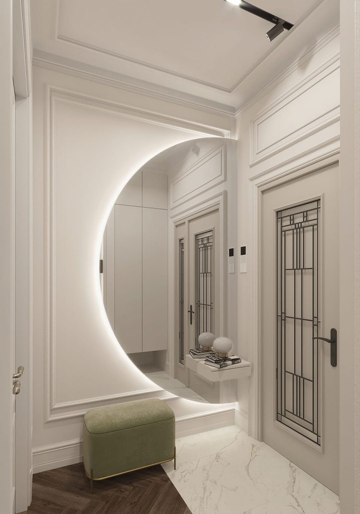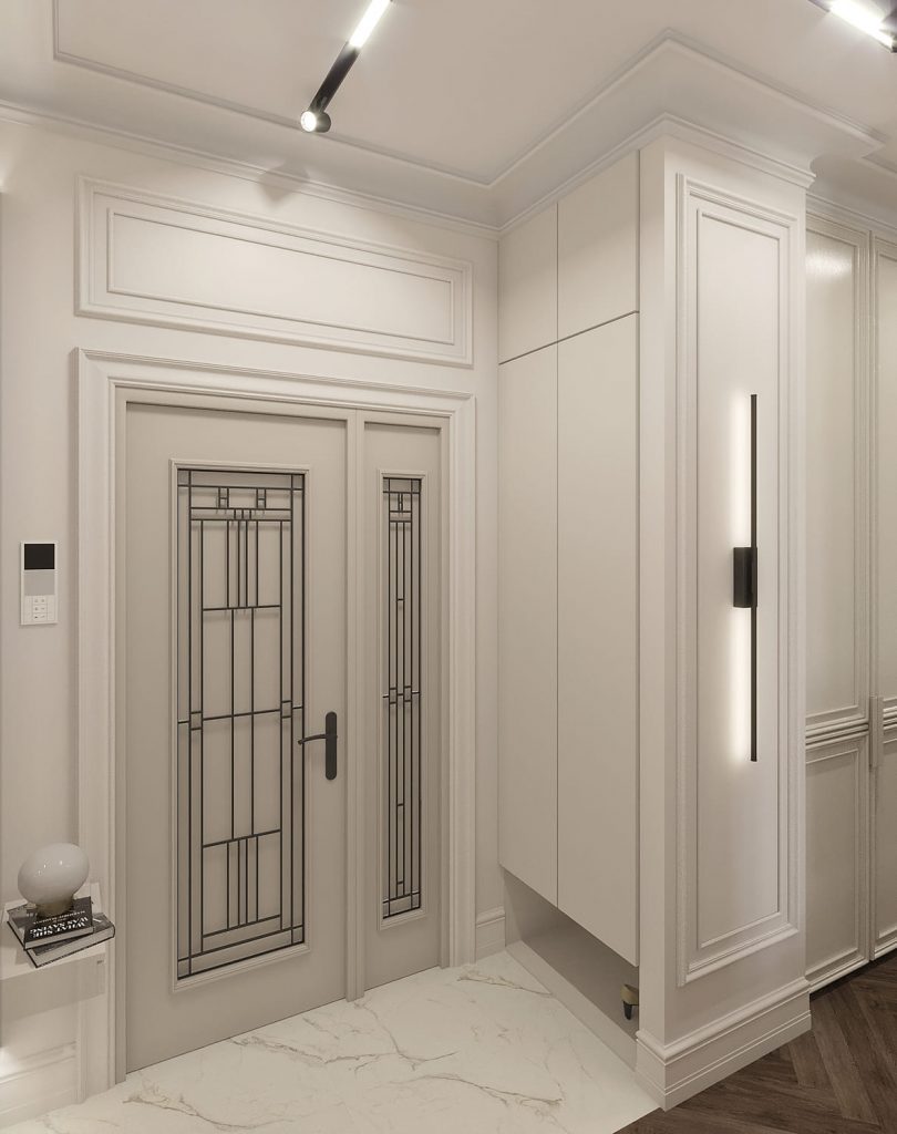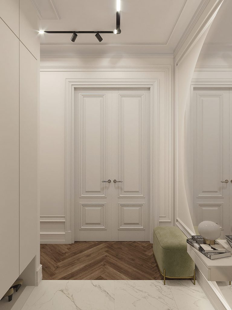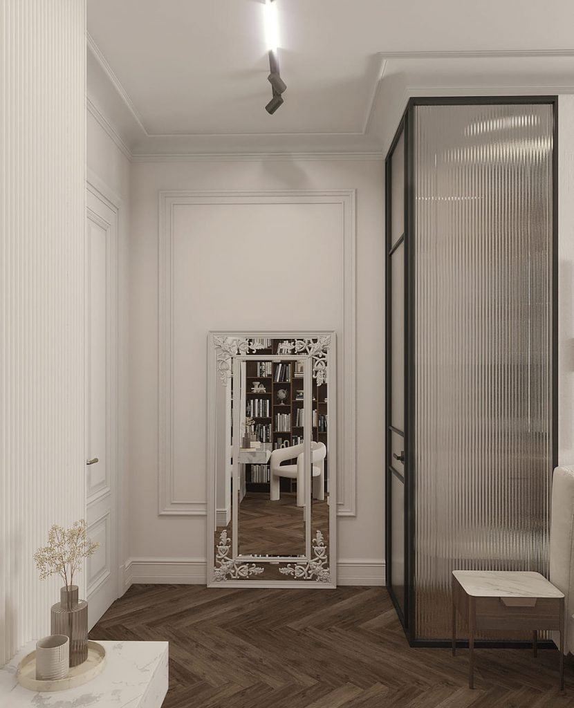 Здесь всё строится на чёткой геометрии и контрасте фактур: светлые стены с тонкой текстурой и классическими молдингами сочетаются с графичной напольной плиткой, создавая динамичный, но не перегруженный образ.