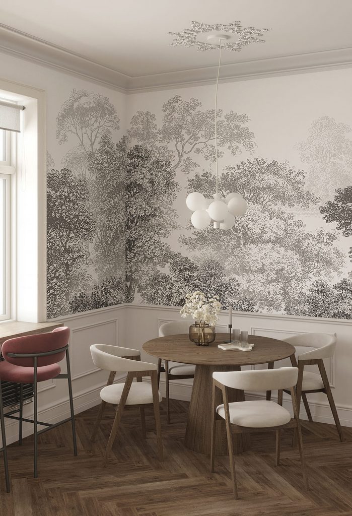 Зону столовой мы оформили у окна: круглый обеденный стол из дерева, удобные стулья с мягкой обивкой и декоративный светильник над центром композиции создают камерную и уютную атмосферу. Контрастная графика на стенах — это обои-панно с ботаническим рисунком, которые добавляют интерьеру глубины и характера.