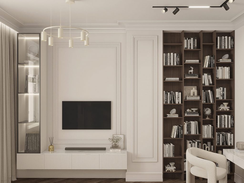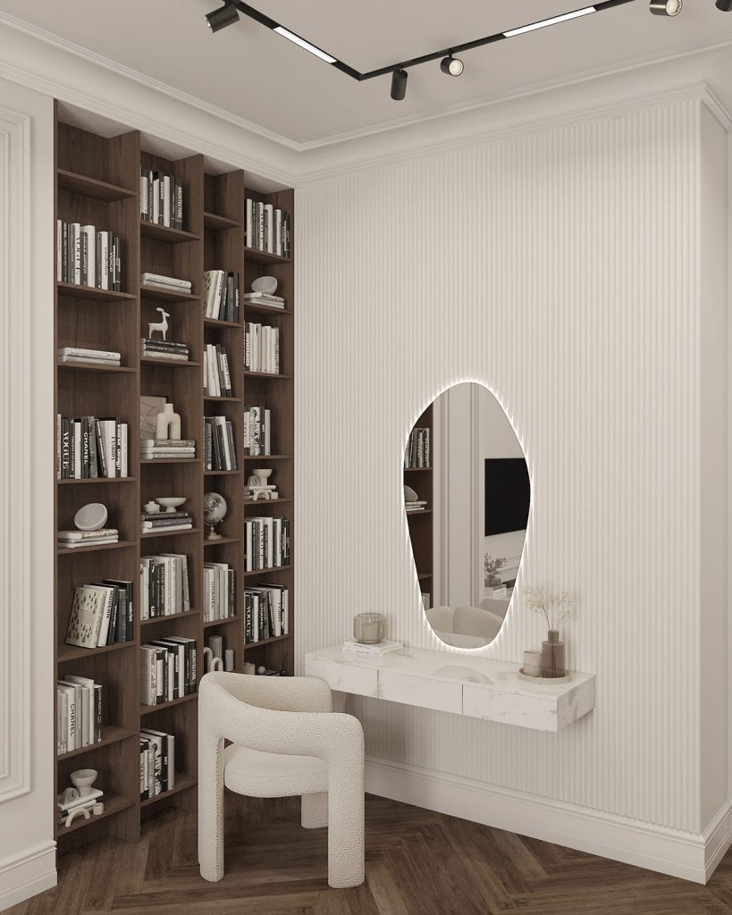 Одна из ключевых деталей спальни — встроенная библиотека из тёмного дерева, которая занимает всю стену и визуально уравновешивает композицию. Она не только декоративна, но и функциональна: в ней достаточно места для книг, аксессуаров и любимых мелочей. Рядом с ней — изящный туалетный столик с подсветкой и зеркалом свободной формы. Светлая boucle-обивка кресла делает эту зону особенно уютной.