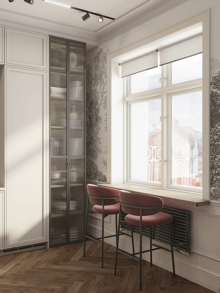 Небольшой бар у окна с видом на Неву — любимое место хозяев, где можно выпить кофе утром или устроиться с ноутбуком днём. Барные стулья с винным акцентом перекликаются с цветом дивана в зоне отдыха и становятся яркими деталями в спокойной палитре.