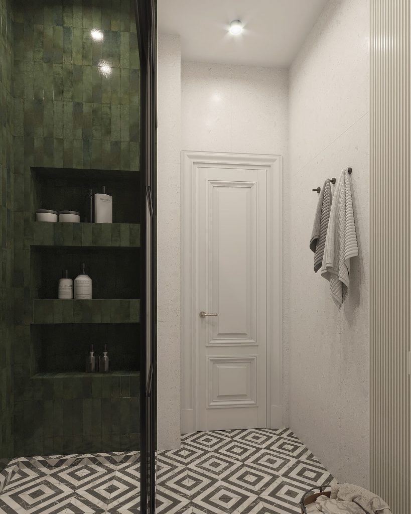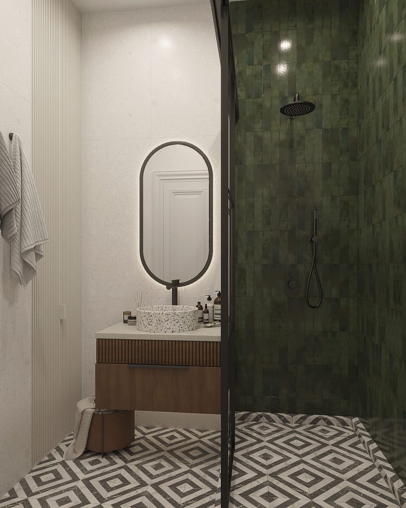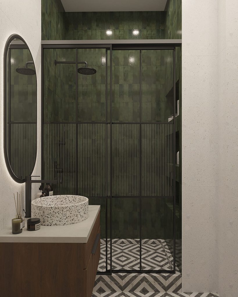 Главный акцент — глубокий, насыщенный зелёный кафель в зоне душа, уложенный вертикально. Его фактура и цвет отсылают к природе и добавляют пространству ощущение уединения и расслабления, как в интерьерах бутиковых отелей.