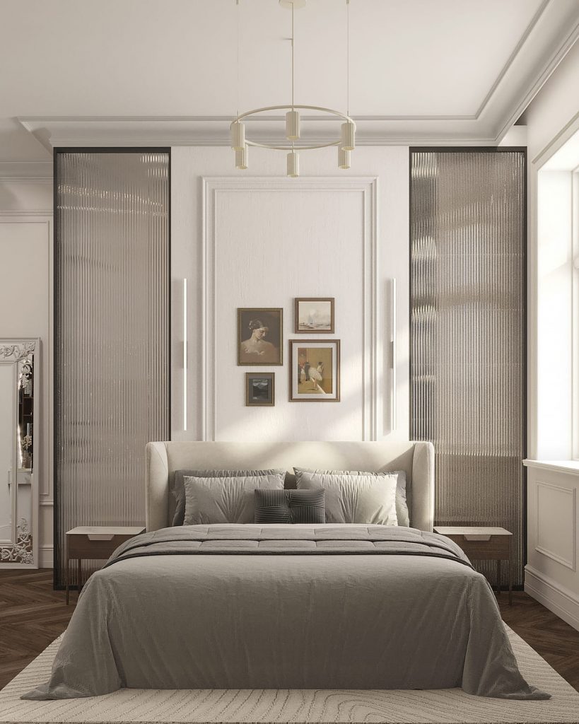 Вся композиция выстроена симметрично: кровать с мягким изголовьем в центре, по бокам — прикроватные тумбы с мраморными столешницами и вертикальные светильники. Фоном служит стена с классическим декором и мини-галереей из винтажных портретов, которые добавляют характер и уют.