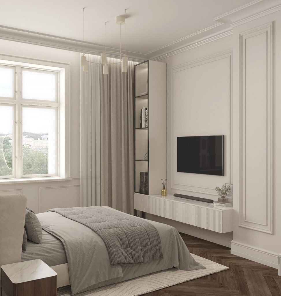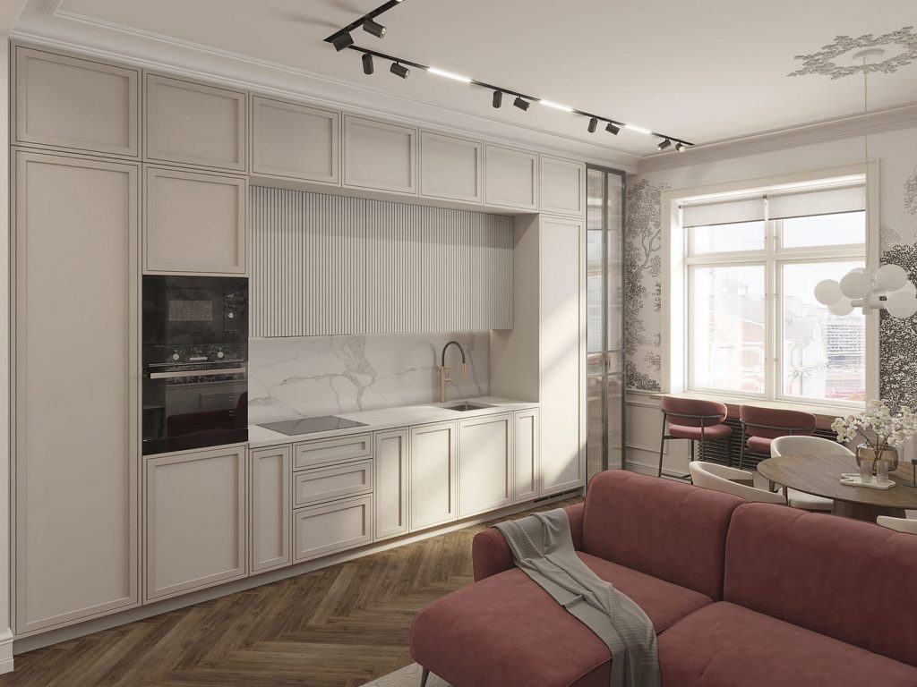 Эта квартира в сталинском доме на берегу Невы — не просто жильё, а пространство, в котором соединились история, архитектурный дух Петроградки и современный подход к жизни семьи. Заказчики — семейная пара с ребёнком — хотели адаптировать интерьер под свой ритм: с удобной кухней-гостиной, отдельной детской, полноценной гардеробной и местом для хранения всего необходимого.