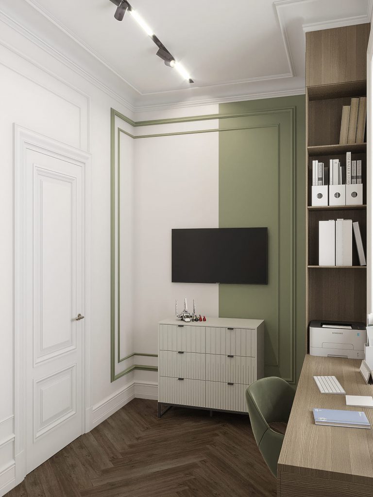 Отдельного внимания заслуживает стена напротив — мы добавили цветовой блок в оливковом оттенке с геометричной рамкой, чтобы сделать интерьер живым и не перегруженным.