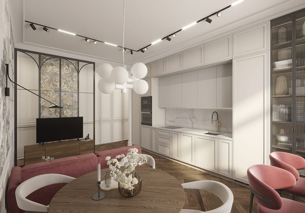 Дизайн-проект двухкомнатной квартиры с лепниной и молдингами, лаконичной мебелью, графичными акцентами и витражными перегородками в светлых, пудрово-бежевых и серых тонах с зелеными и винными акцентами с прихожей и коридором, кухней-гостиной, спальней, детской, душевой комнатой и туалетом