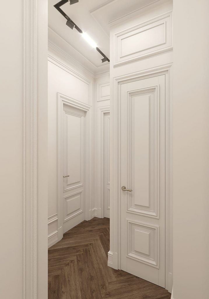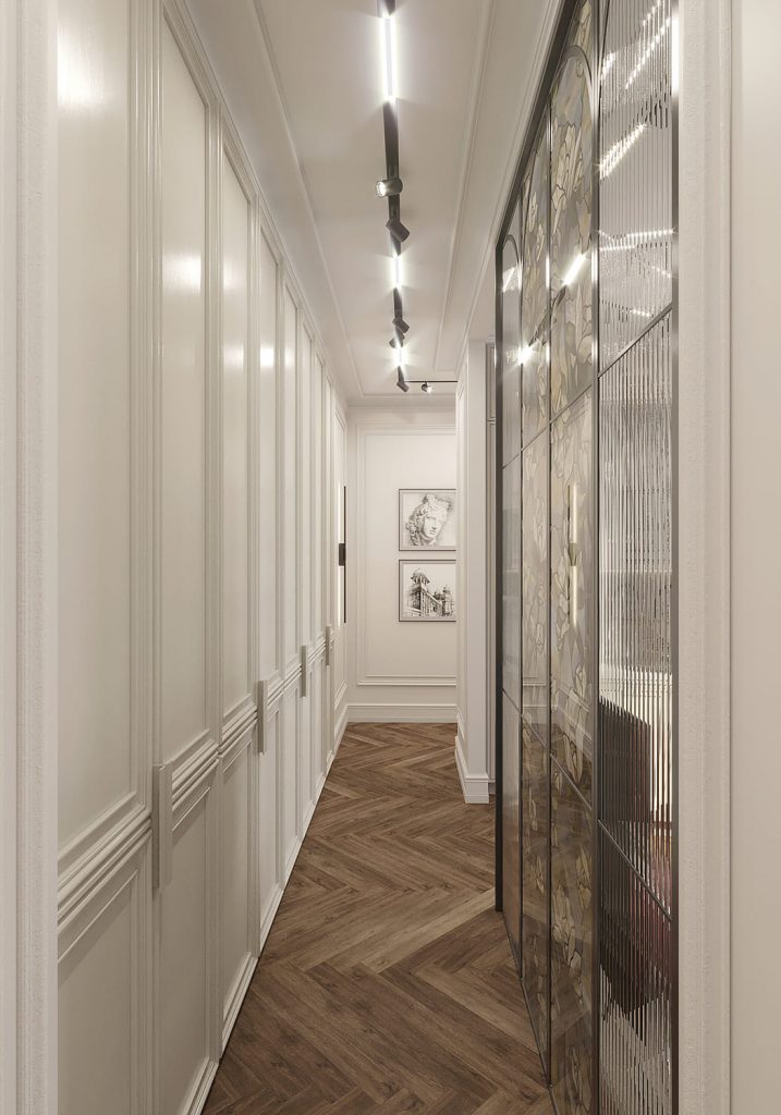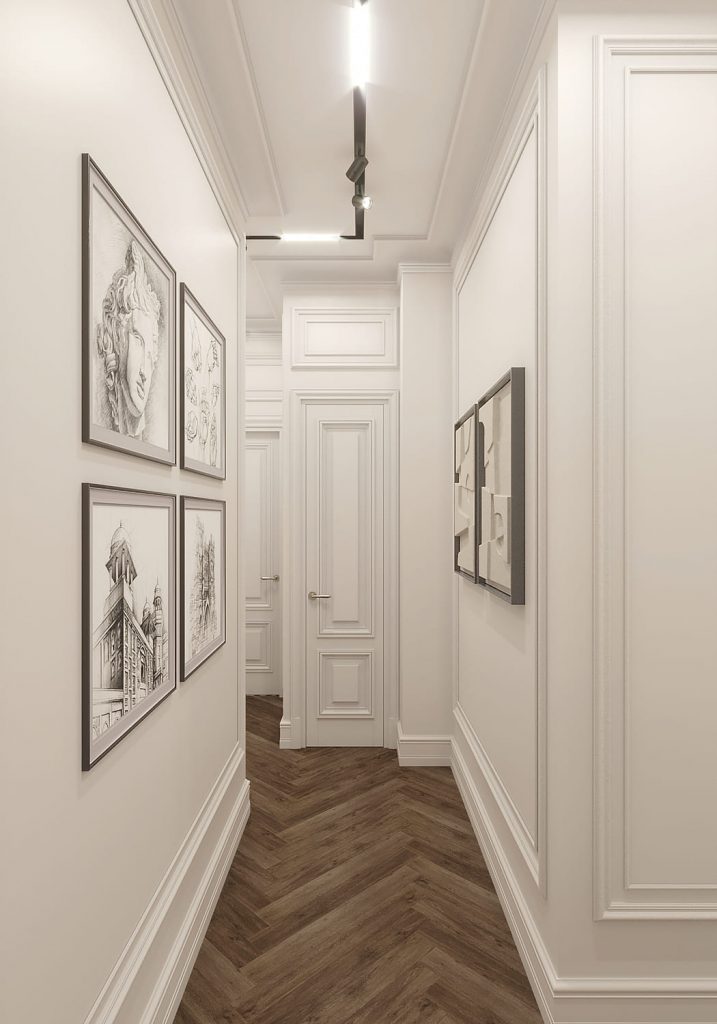 Стены украшены молдингами и графикой в классических рамках — мы добавили рисунки и архитектурные зарисовки, которые перекликаются с историческим контекстом дома и создают ощущение галерейного коридора. Потолки украшены изящной лепниной, а пол выполнен в виде ёлочки из тёплого дерева — придаёт коридору уют и продолжает общий стиль квартиры.