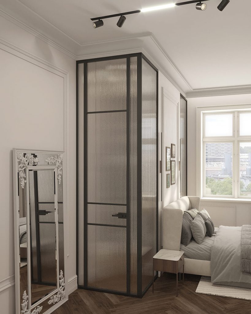 Гардеробная выполнена в виде стеклянного объёма с графитовым каркасом и рифлёными стёклами — такая конструкция скрывает содержимое, но визуально не перегружает пространство. Благодаря этому спальня остаётся светлой и визуально просторной, даже несмотря на сложную планировку и насыщенность функциональных зон.
