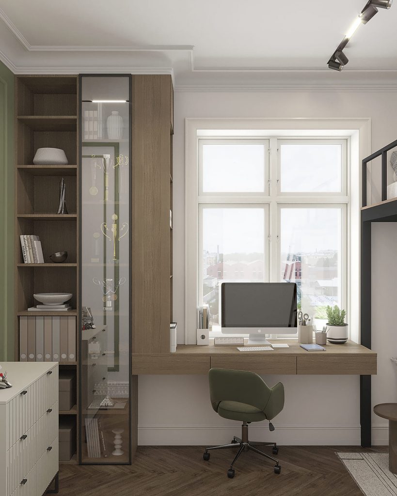 Рабочая зона расположена у окна: большое светлое окно даёт достаточное количество естественного света для занятий. Стол — встроенный, с лаконичными выдвижными ящиками и высоким модулем для хранения. Над столом — открытые и закрытые полки, которые легко адаптируются под школьные принадлежности, книги или хобби ребёнка.