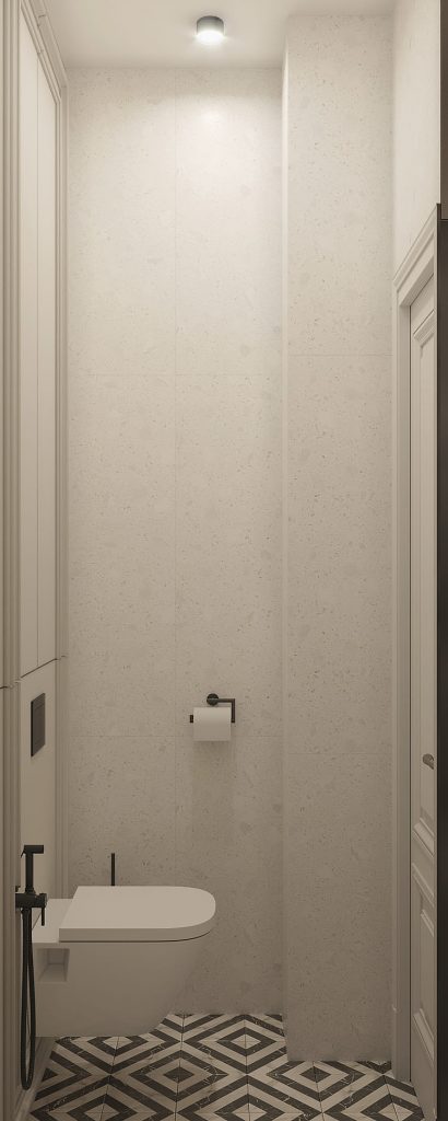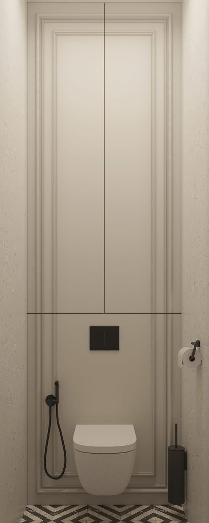 Инсталляция утоплена в стену с декоративной филёнкой, за которой скрывается шкаф для хранения бытовой химии и мелочей. Чёрные матовые акценты — кнопка смыва, держатель туалетной бумаги, гигиенический душ и ёршик — визуально связывают эту комнату с остальными элементами интерьера, подчёркивая современный подход в рамках неоклассики.