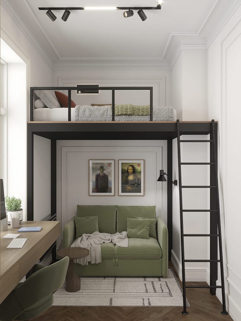 Нижний уровень стал местом для отдыха и чтения: здесь разместился компактный зелёный диван, который при необходимости можно разложить. Его цвет задаёт тёплый, природный акцент всей комнате, и поддерживается креслом и настенным декором. Рядом — удобный поворотный светильник для вечернего чтения.